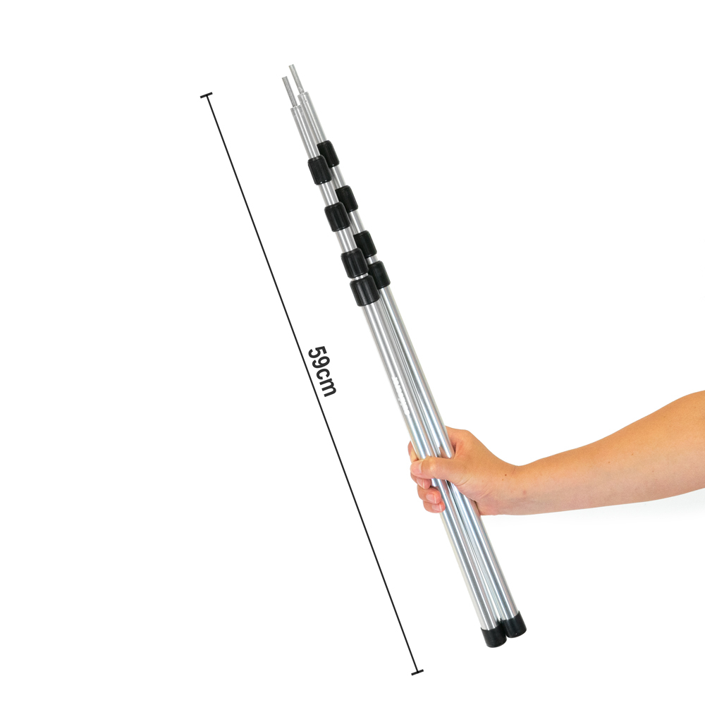 Die beiden Aufstellstangen bestehen aus je drei einzelnen Segmenten (mit einem Durchmesser von 12 - 20 mm) und lassen sich in der Höhe teleskopierbar zwischen 59 cm und 188 cm einstellen. So wird die ideale Länge sichergestellt. Insgesamt wiegen die beiden Zeltstangen aus Aluminium nur ultraleichte 540 g und sind somit besonders einfach und unkompliziert zu transportieren. Das Einstellen erfolgt über Drehverschlüsse - also ähnlich wie von Bergstöcken bekannt. Dabei werden die 3 Segmente auseinandergezogen und im Anschluss im Uhrzeigersinn gedreht und dadurch fixiert.