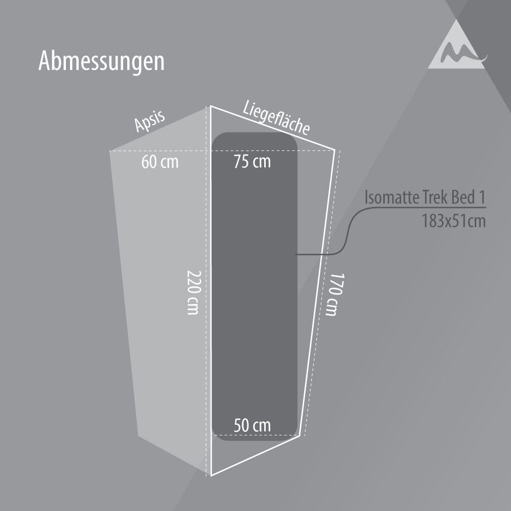 - Maße: 220 x 135 cm (davon 75 cm Schlafkabine, 60 cm Apsis), Höhe: 103 cm (Kopfbereich), 62 cm (Fußbereich)