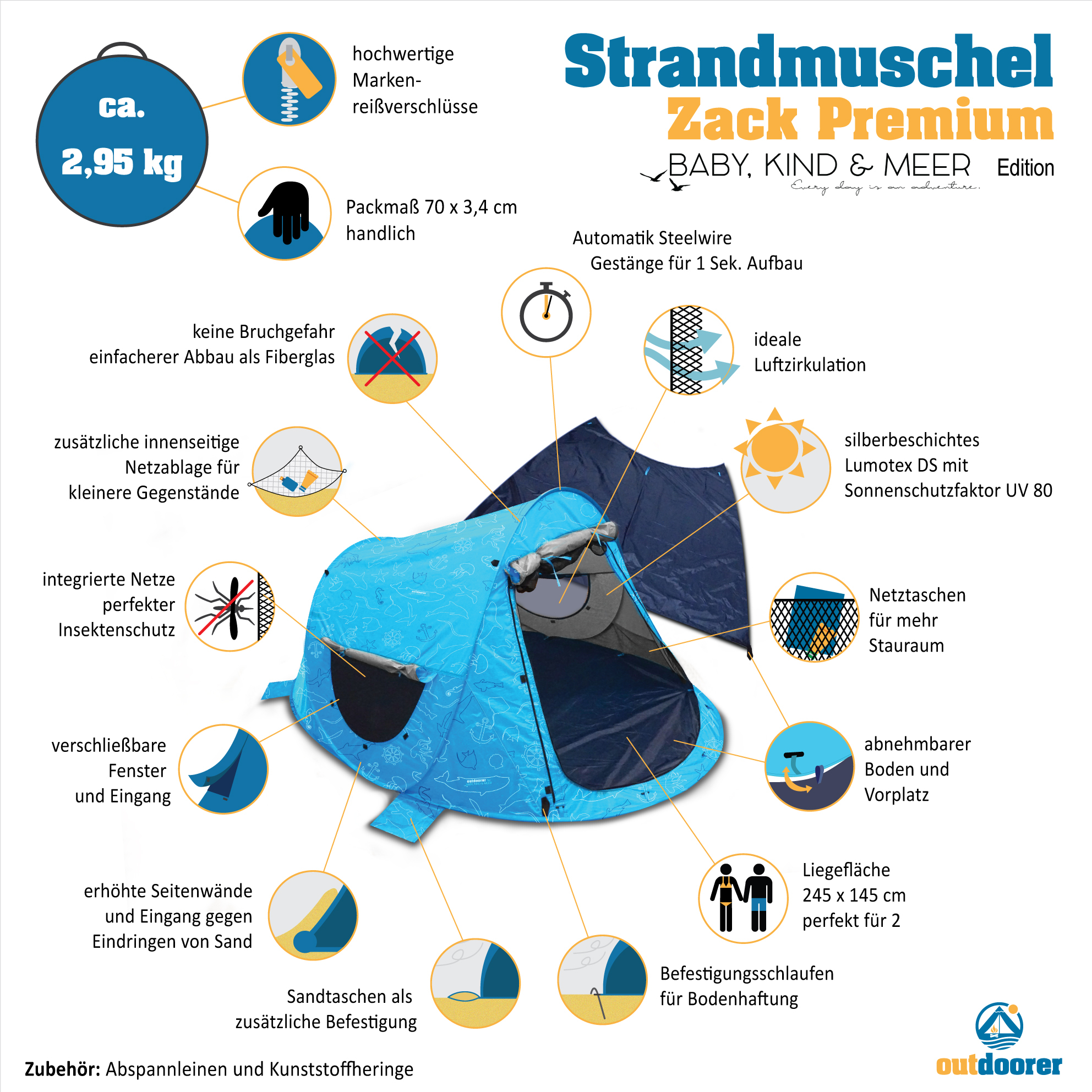 Ob verschlossen für den Mittagsschlaf oder offen für Spielspaß mit Meeresblick – die Zack Premium Baby & Kind Meer passt sich deinem Familienalltag am Strand flexibel an. Dank des großzügigen Vorplatzes hast du genug Raum, um Taschen, Sandspielzeug oder Snacks griffbereit zu verstauen, ohne dass der Innenraum vollgestellt wirkt.