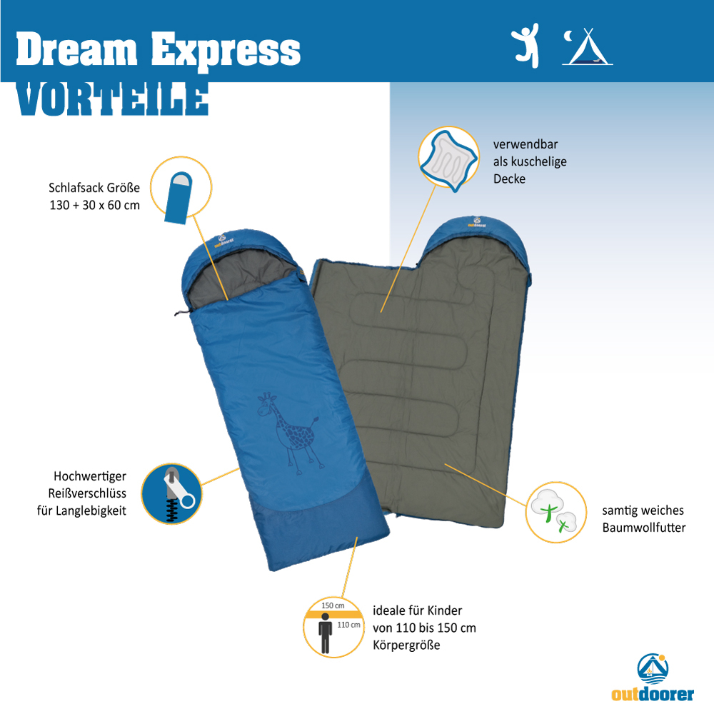 Kinderschlafsack Dream Express - der speziell auf die Bedürfnisse und die Körpergröße von 110 cm bis 150 cm abgestimmte Kinderschlafsack von outdoorer. Eure Kids werden begeistert sein vom kuscheligen Innenfutter, der kräftigen blauen Farbe und dem lustigen Giraffenmotiv des Dream Express. Ob bei Übernachtung im Baumhaus, Zelt, Wohnmobil, Campingbus, auf einer Berghütte oder sogar unter freiem Sternenhimmel - mit diesem Kinderschlafsack seid ihr bestens ausgestattet für den Familienurlaub!