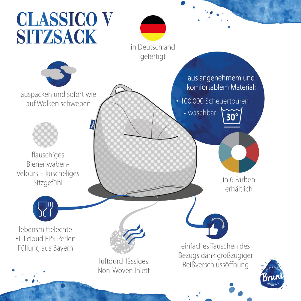 Bruni vereint bayerische Manufakturarbeit, österreichischen Stil und internationales Design. Auf Bruni-Sitzsäcken genießt du puren Komfort und kannst wie auf Wolken entspannen!