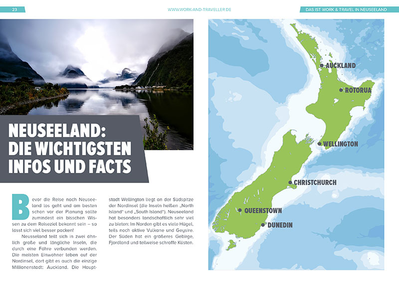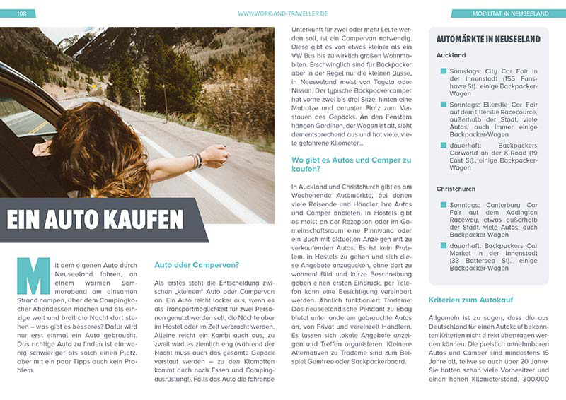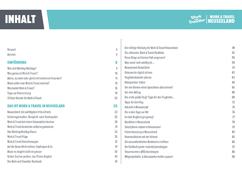 In diesem Nachschlagwerk findest du alle wichtigen Informationen für eine reibungslose Planung deines Work and Travel-Abenteuers. Auf mehr als 190 Seiten leitet dich der Guide durch Themen wie Visumbeantragung, Flug, Autokauf und Jobsuche, sowie Gepäck, Unterkunft, Städte und Kostenvergleiche. Zusätzlich liefern dir unsere Experten unzählige Tipps und Tricks, um dir bei aufkommenden Problemen zu helfen und deine Zeit in Neuseeland so stressfrei wie möglich zu gestalten. Unser Guide hilft dir durch die gesamte Planung und lässt dabei keinen Themenbereich aus. Zusätzlich sparst du bis zu 600€ für eine Organisation.