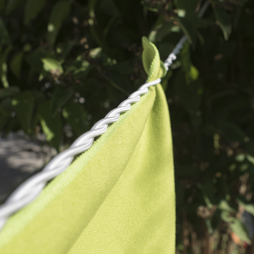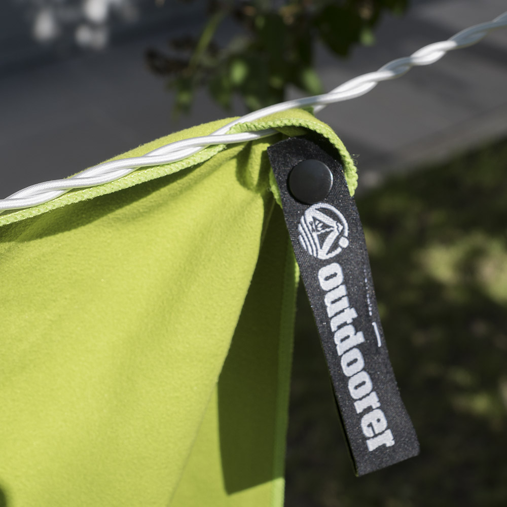 Sehr praktisch ist dabei, dass durch die beiden zusammengedrehten Gummiseile Wäscheklammern nicht nötig sind, da man hier leicht Kleidungsstücke, Badetücher, Campinglampe oder auch schwere Gegenstände - wie zum Beispiel den nassen Tauchanzug - darauf aufhängen kann.