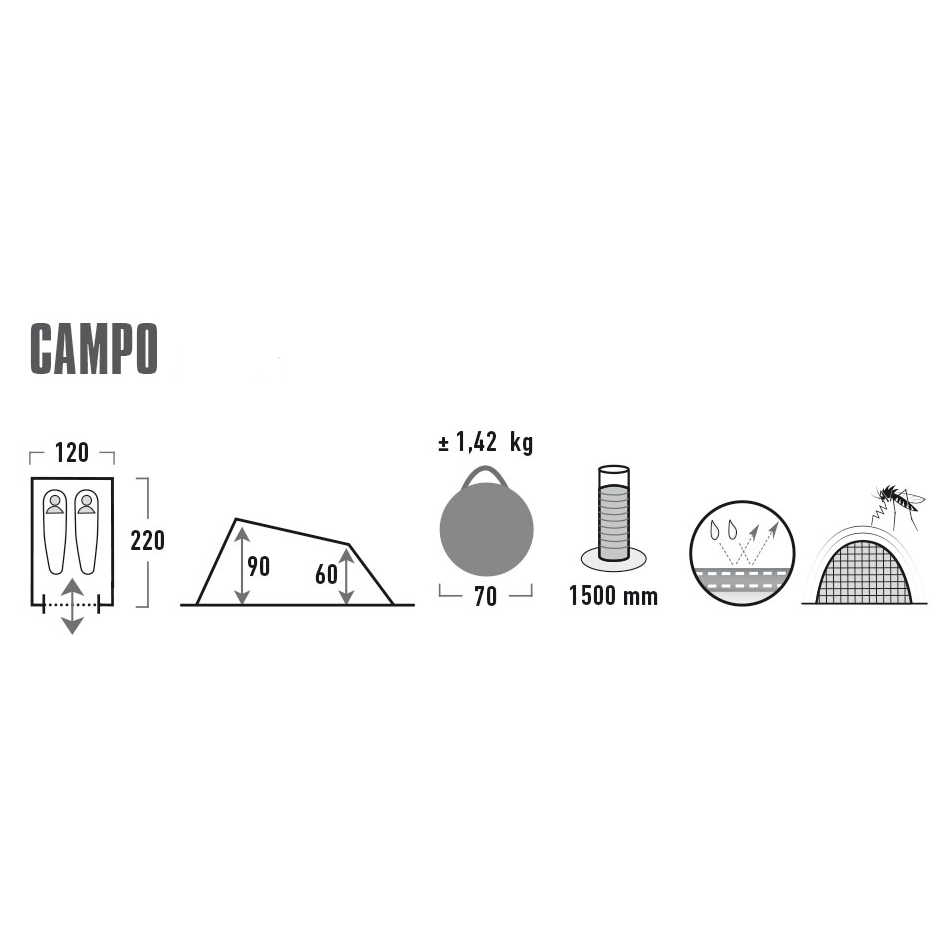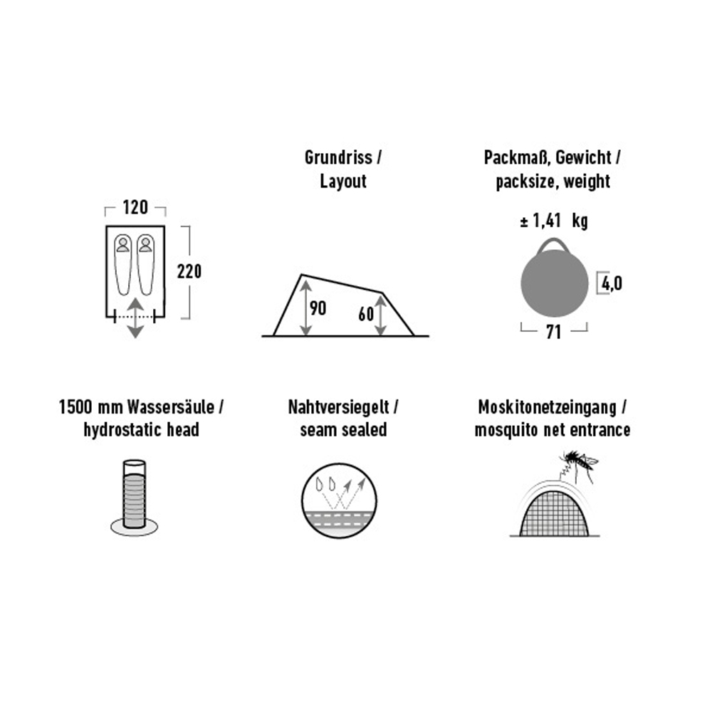 - Überzelt: 190 T, 100 % Polyester, PU-beschichtet, 2.000 mm Wassersäule