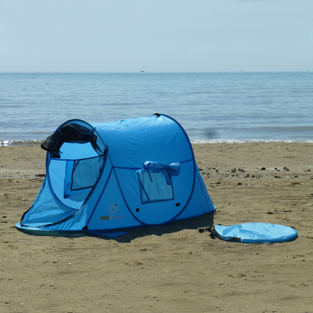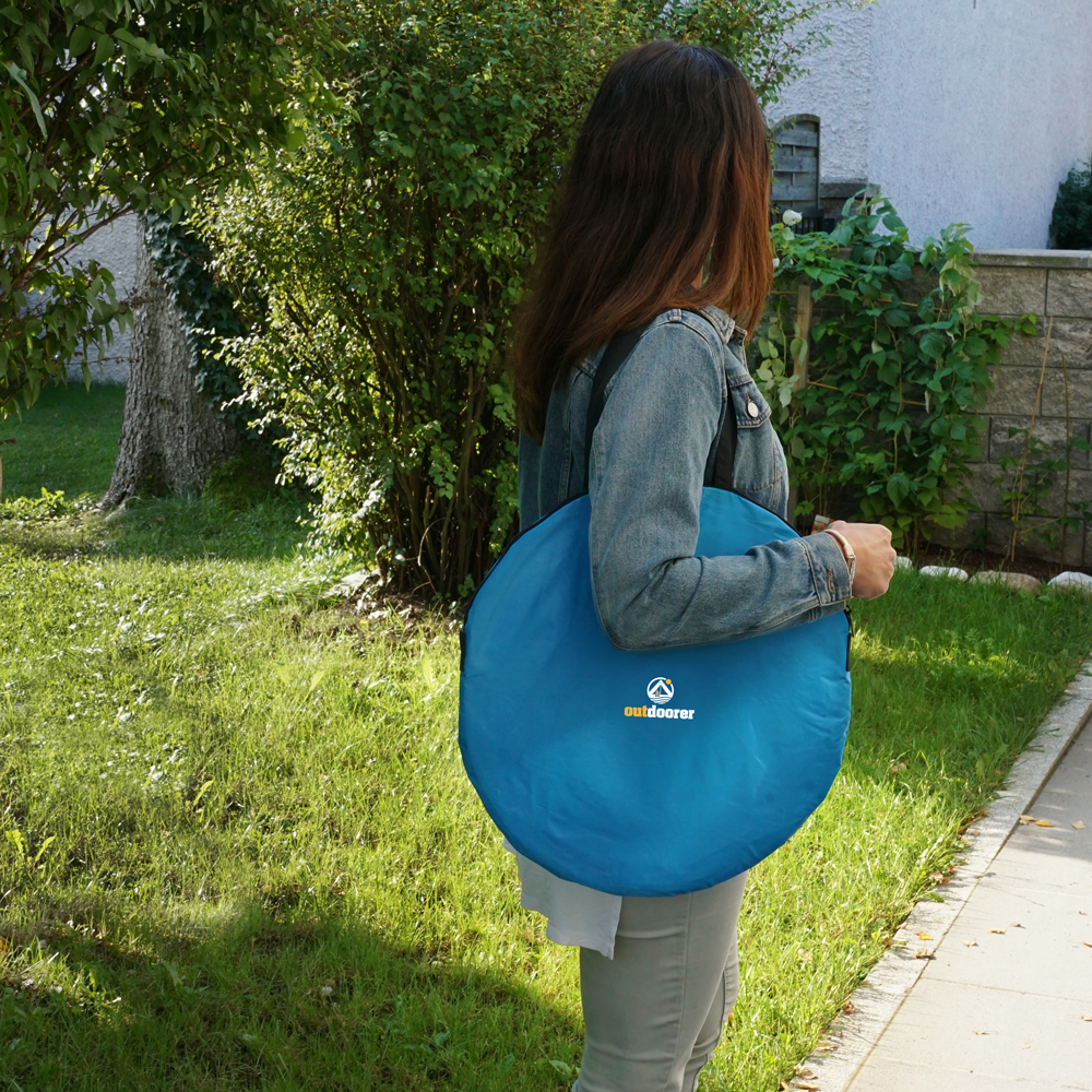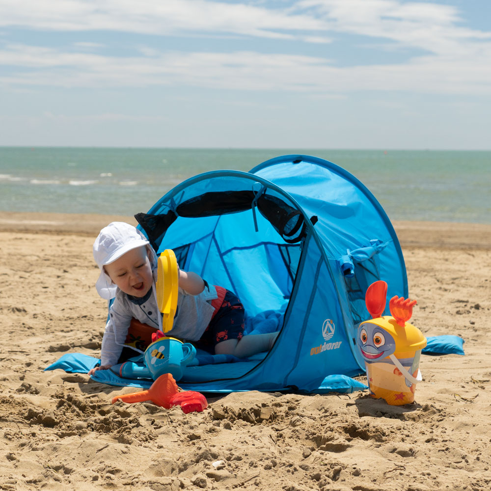 Die blaue Pop Up Strandmuschel Zack Premium von outdoorer gibt es auch in der Kinder Variante Zack Premium Baby. Die tollen Eigenschaften sind alle gleich geblieben, nur dass die Strandmuschel speziell an die Bedürfnisse von Babys und Kindern angepasst wurde. Das Highlight: Der Eingang lässt sich mit einem feinmaschigen Moskitonetz verschließen. Insekten haben keine Chance!