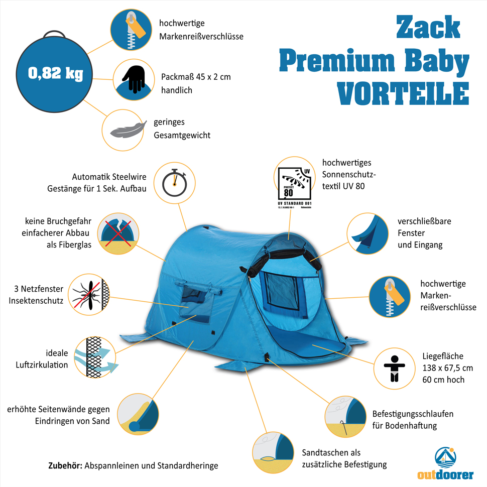 outdoorer liegt euer Wohl und das eurer Kinder besonders am Herzen. Die zarte Baby- und Kinderhaut gehört am Strand noch mehr geschützt, denn sie reagiert sehr sensibel auf zu viel Sonne. Ein Sonnenbrand ist schnell passiert und sehr schmerzhaft für die Kleinen. Damit euch das nicht passiert, hat outdoorer seine Kinder-Strandmuschel Zack Premium Baby mit dem höchstmöglich zertifizierbaren Lichtschutzfaktor UV 80 nach Standard 801 (gilt bei geschlossenen Fenstern) ausgestattet. Getestet und zertifiziert wurde er vom namhaften Institut Hohenstein in Deutschland.