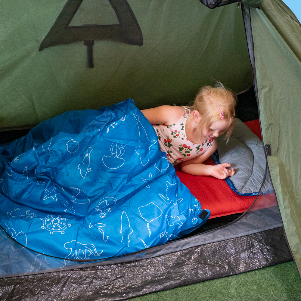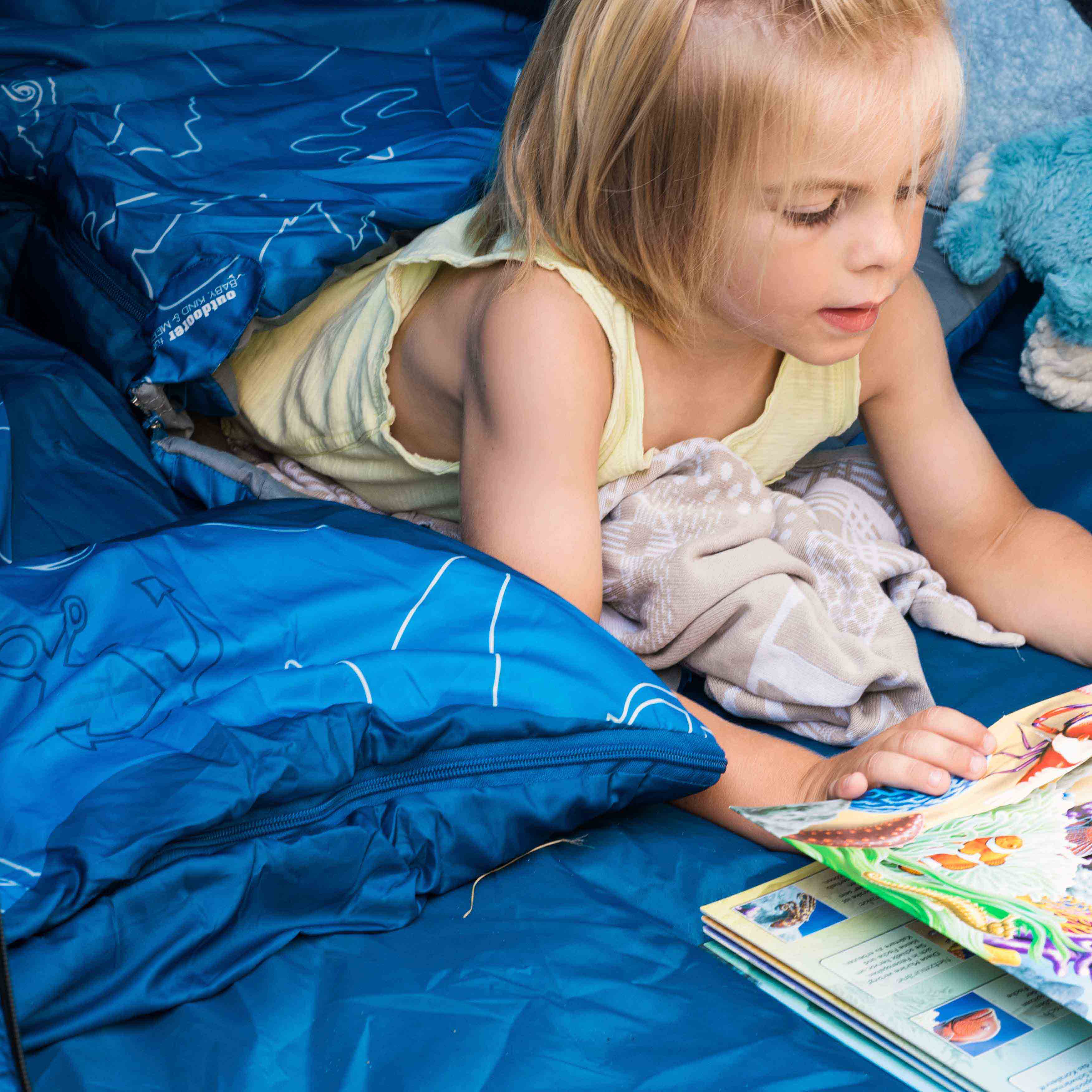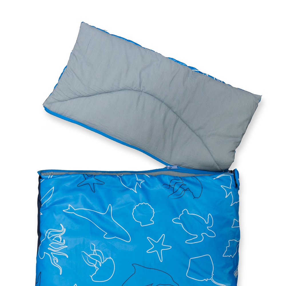 Der Kinderschlafsack Dream Sailor „Baby, Kind & Meer“ bietet mit Abmessungen von 130 x 60 cm in seinem Inneren jede Menge Platz für den Nachwuchs. Zusätzliche 30 x 60 cm misst das integrierte Kissen, das optional abgenommen und für zusätzlichen Komfort befüllt werden kann. Dabei wird dein Kind die maritimen Motive, mit denen der Schlafsack bedruckt ist, lieben – Fische, Quallen, Muscheln, Seesterne und Schildkröten begleiten es bei jahrelangen nächtlichen Campingabenteuern in den Schlaf.