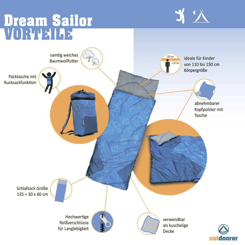 Am Reiseziel angekommen, verspricht der leichte Kinderschlafsack neben hohem Komfort auch Flexibilität. Denn nicht immer wollen Kinder in den Schlafsack „gezwängt“ sein. Zusätzliche Freiheit gewährt deshalb die Deckenschlafsack-Funktion, wodurch der Dream Sailor „Baby, Kind & Meer“ zum idealen Begleiter für Campingausflüge oder Übernachtungen bei den ersten Freunden wird.