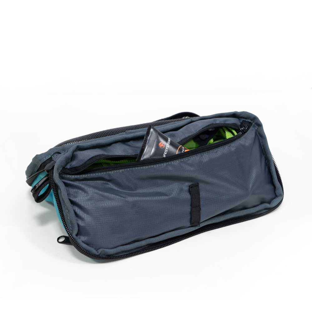 Dank eines robusten Bandes kann die Kulturtasche beispielsweise an einem Haken oder einem Ast aufgehängt werden, um den Wash Butler S vor Nässe und Schmutz und in Greifnähe zu bewahren. Hinter diesem Haken befindet sich noch ein praktisches Fach, das sich ideal als „Abstellfläche“ für Duschgel, Zahnpasta etc. eignet, so bleiben beide Hände für Morgen-/Abendtoilette und Körperpflege frei. Zusätzlich ist in das Innere des kleinen Waschbeutels ein mittig fixiertes Gummiband genäht – perfekt, um Zahnbürste oder Handrasierer zu transportieren.