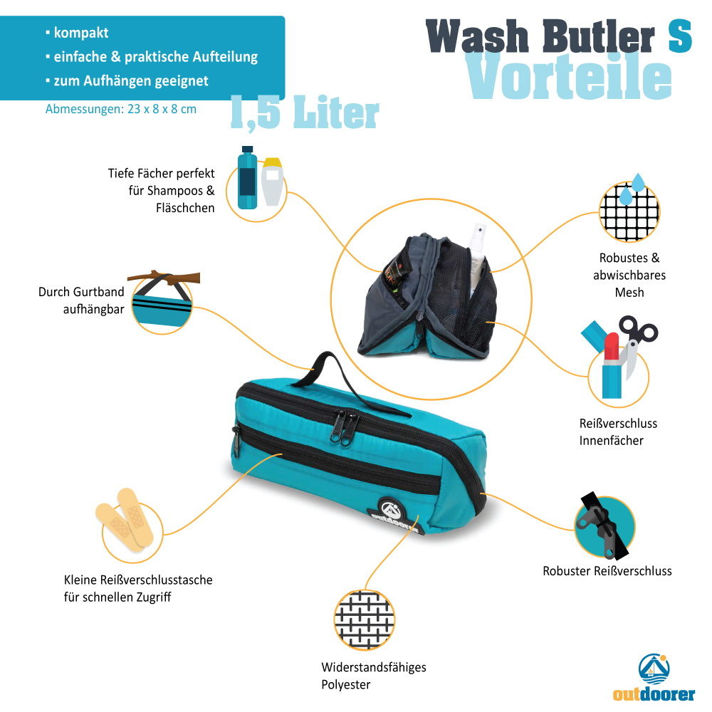 Der Wash Butler S von outdoorer wird als Waschbeutel dank seiner handlichen Abmessungen von 23 x 8 x 8 cm und einem ultraleichten Gewicht von nur 113 g dein unverzichtbarer Begleiter auf Reisen. Dabei weist das Necessaire in stylischem Türkis ein geräumiges Volumen von 1,5 l auf.