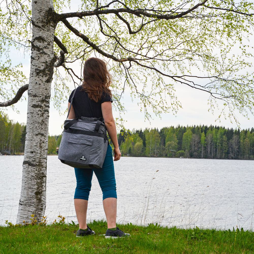 Da die Kühltasche faltbar ist, lässt sie sich nach dem Gebrauch wieder einfach verstauen. Zudem kannst du dir die Isoliertasche mit verstellbarem Schultergurt umhängen oder am ummantelten Griff schnappen. Letzterer ist gepolstert, damit du die Kühltasche angenehm tragen kannst.