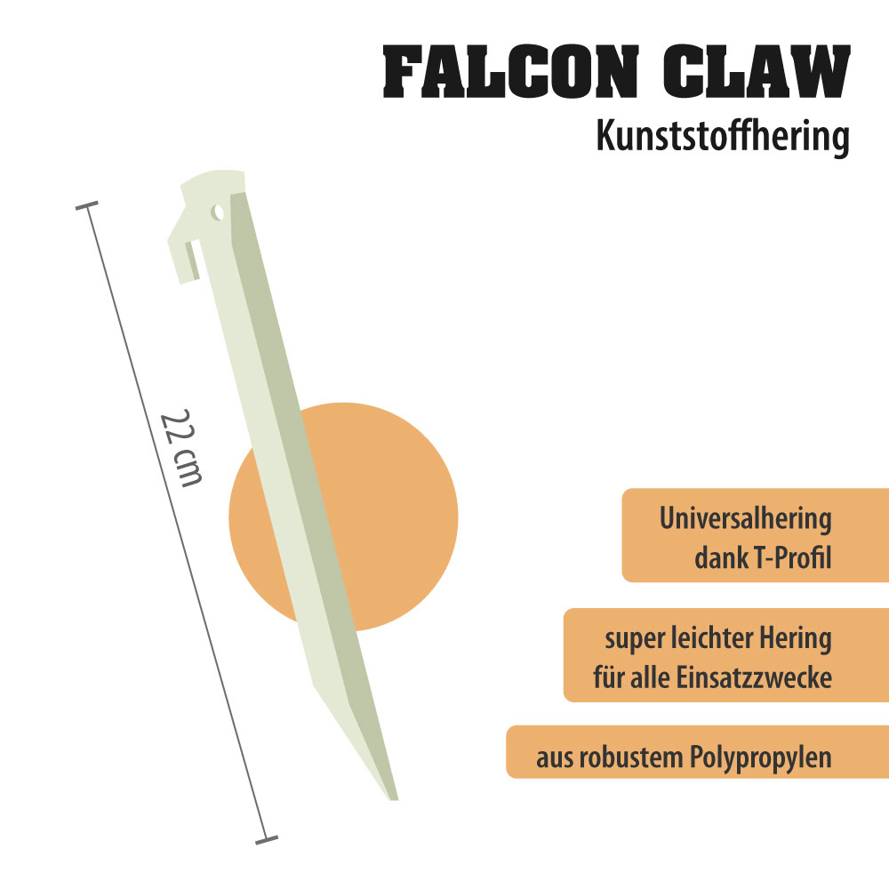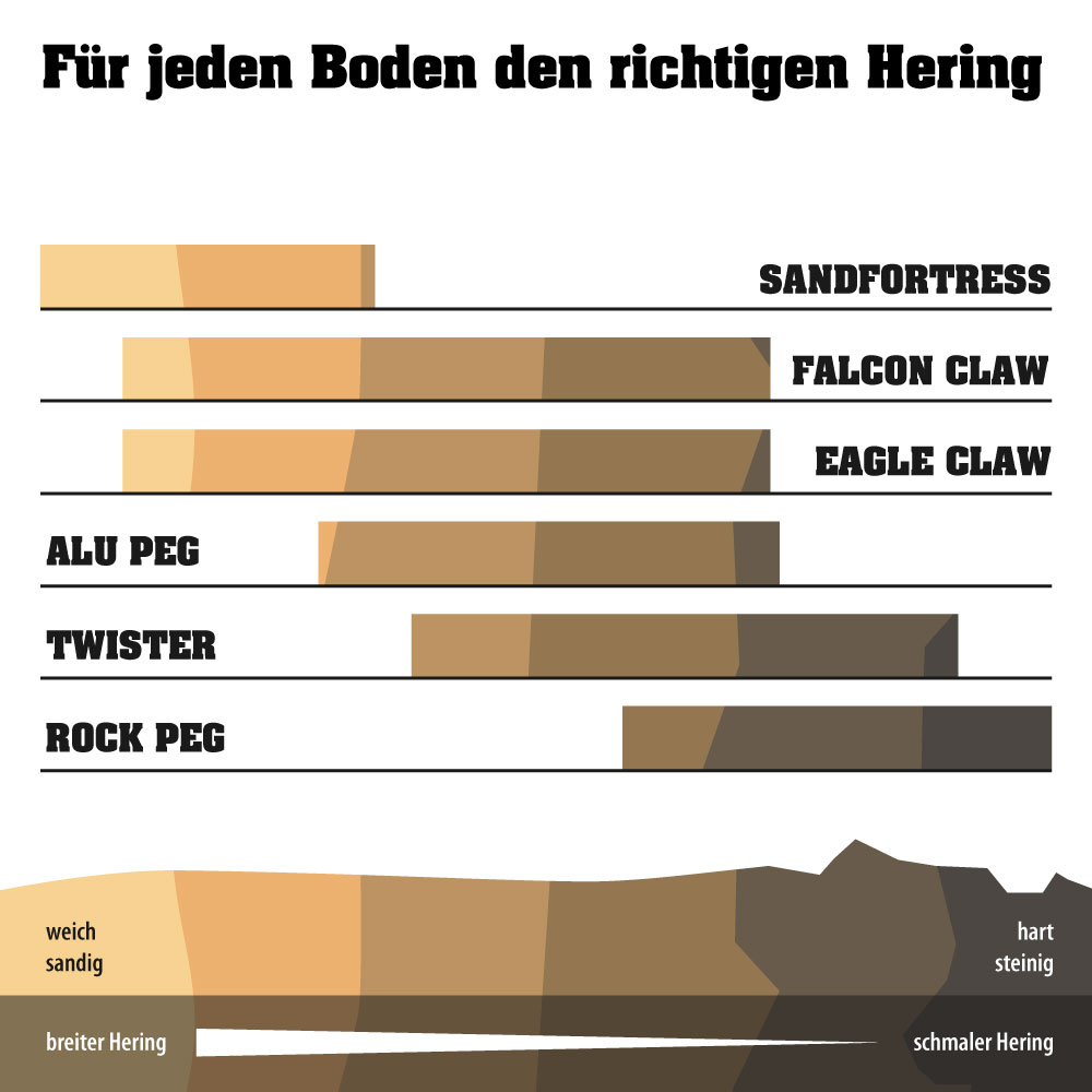 Die Kunststoffheringe Eagle Claw haben ein T-Profil und sind damit echte universell einsetzbare Heringe. Sie eignen sich bestens für den Einsatz bei Wald- und Wiesenböden, können aber auch bei härteren Böden und im Sand eingesetzt werden.Um optimal für den Campingausflug gerüstet zu sein, braucht es auch die richtigen Heringe. Vielleicht ist es dir schon einmal aufgefallen, dass sich deine Heringe nicht in jedem Boden gleich sicher verankern lassen. Welcher Hering ideal für den Boden ist, hängt von der Bodenbeschaffenheit ab. Für durchmischte Wald- und Wiesenböden hat outdoorer den robusten Kunststoffhering Eagle Claw entwickelt. Dieser ist leicht, aber dennoch sehr stabil. Technische Facts - PP Kunststoffheringe Eagle Claw Für durchmischte Böden, wie Wald und Wiesen 8 Stück in der Packung T-Profil Länge: 23 cm Aus Polypropylen Bodenbeschaffenheit für Auswahl des richtigen Herings entscheidend Grundsätzlich gilt die Faustregel: Je fester der Boden, desto dünner der Hering. Für Felsböden werden beispielsweise Felsnägel verwendet. Diese sind dünn und mit einer Spitze versehen, damit sie in felsigen Böden oder Felsspalten sicher halten. Das genaue Gegenteil ist der Sandhering für weiche, sandige Böden. Er zeichnet sich durch sein breites U- oder Y-Profil aus. Damit findet er in lockeren Böden genügend Halt. T-Profil für durchmischte Wald- und Wiesenböden Die Kunststoffheringe Eagle Claw haben ein T-Profil und sind damit echte universell einsetzbare Heringe. Sie eignen sich bestens für den Einsatz bei Wald- und Wiesenböden, können aber auch bei härteren Böden und im Sand eingesetzt werden. Das T-Profil macht den Hering sehr stabil und er verbiegt sich bei richtiger Anwendung nicht. Solltest du dir bezüglich der Bodenbeschaffenheit deines Zeltplatzes unsicher sein, empfiehlt dir outdoorer die Verwendung von Heringen mit T-Profil. Leicht und dennoch stabil dank Polypropylen Der Zelthering Eagle Claw ist aus Polypropylen gefertigt. Dieser Kunststoff zeichnet sich durch seine hohe Stabilität aus, deshalb ist er für den Einsatz als Zelthering bestens geeignet. Selbst bei der Verwendung bei harten Böden verbiegt er sich nicht. Als Kunststoffhering ist er auch wesentlich leichter als ein Hering aus Metall. Tipps zur richtigen Anwendung Damit du deine Heringe Eagle Claw lange verwenden kannst, solltest du zwei Dinge beachten. Zeige beim Einschlagen etwas Gefühl. Ein Hering muss nicht mit einem Schlag im Boden versenkt werden. Mehrere sanfte Schläge sind hier wesentlich zielführender, denn du weißt nicht, ob sich nicht ein größerer Stein im Erdreich befindet. Nimm das richtige Werkzeug mit. Gummihammer und Heringsheber gehören zu jeder Campingausstattung. Damit kannst du die Heringe sicher einschlagen und auch wieder entfernen.