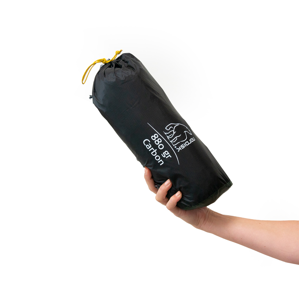 - Lieferumfang: Packsack (Tragegriff und Kordelzug), 4 Heringe (Aluminium - Nordisk Triple Twister), Abspannleinen (2 mm Dyneema)