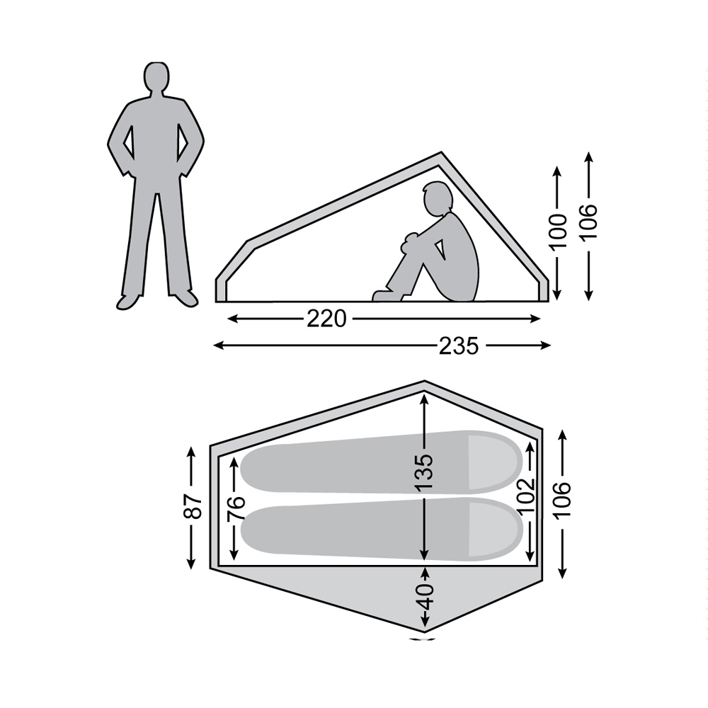 Nicht nur das Gewicht des Ultraleichtzelts Telemarkt 2 ist optimiert, sondern auch das Packmaß. Mit 12 x 41 cm ist es nur geringfügig größer als eine 1,5 l PET-Flasche. Aufgebaut erreicht das Zelt aber Innenmaße von 220 x 135 x 100 cm und ist somit groß genug, dass zwei Personen darin schlafen können. Dank der Apsis ist auch genügend Platz für deine Ausrüstung und Schuhe, um diese sicher vor Umwelteinflüssen im Zelt zu schützen.
