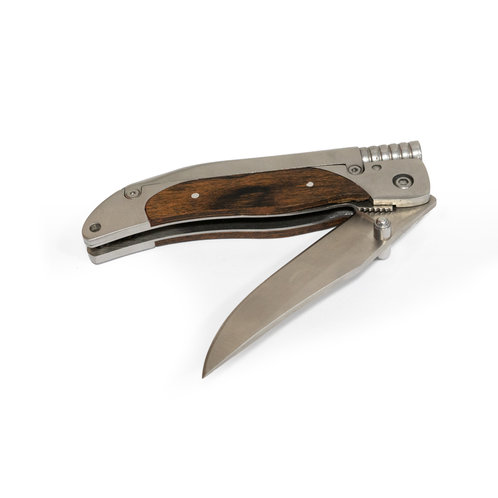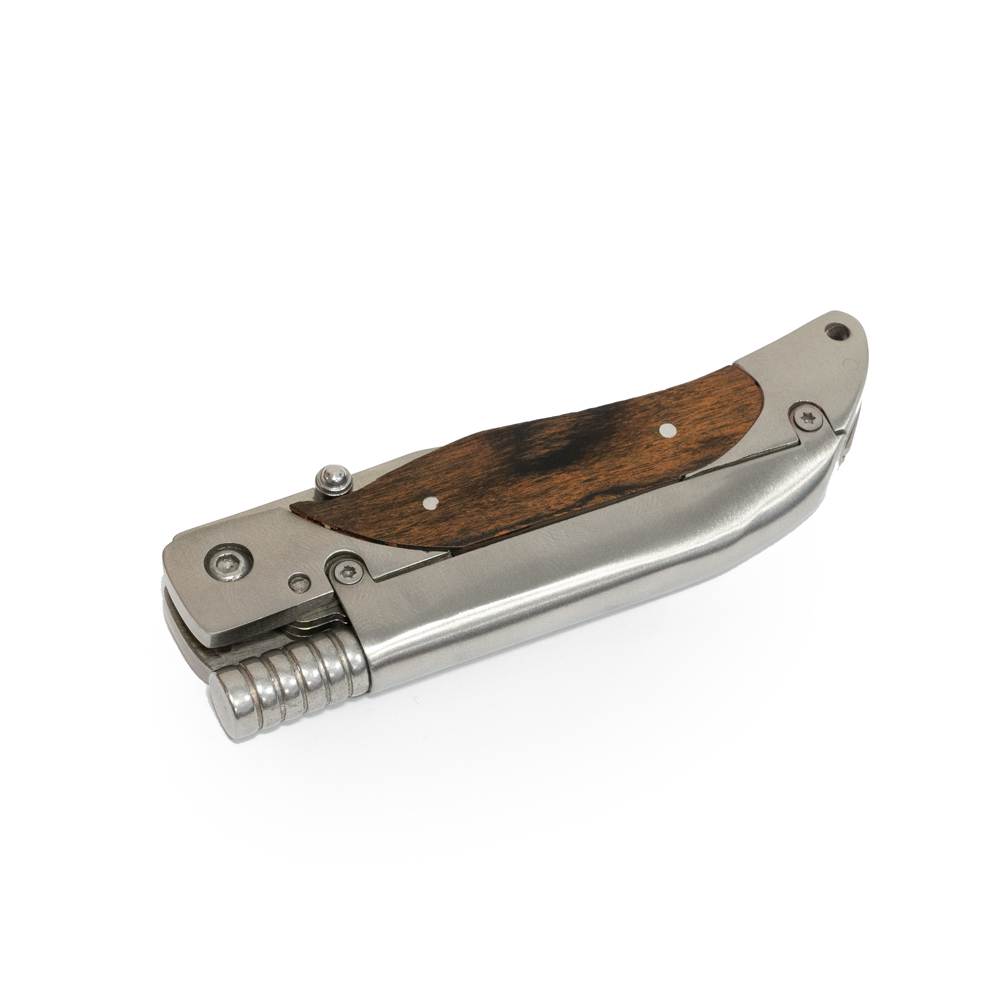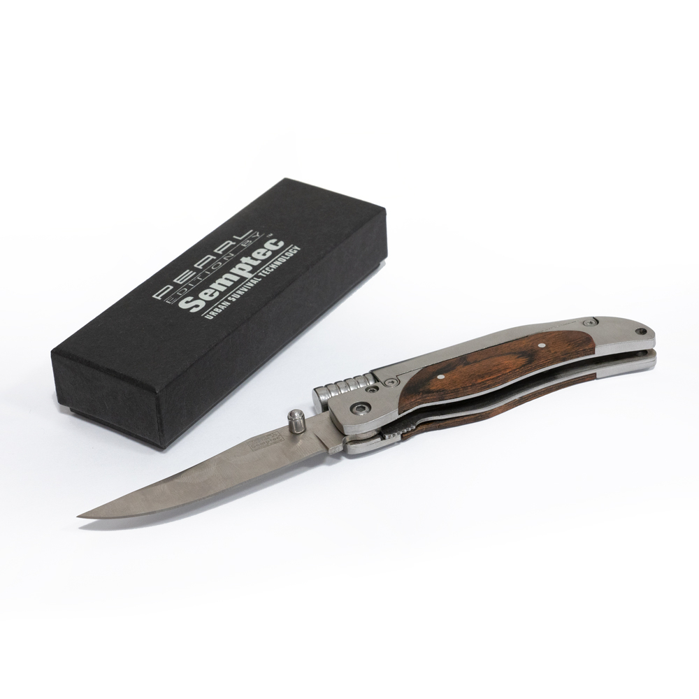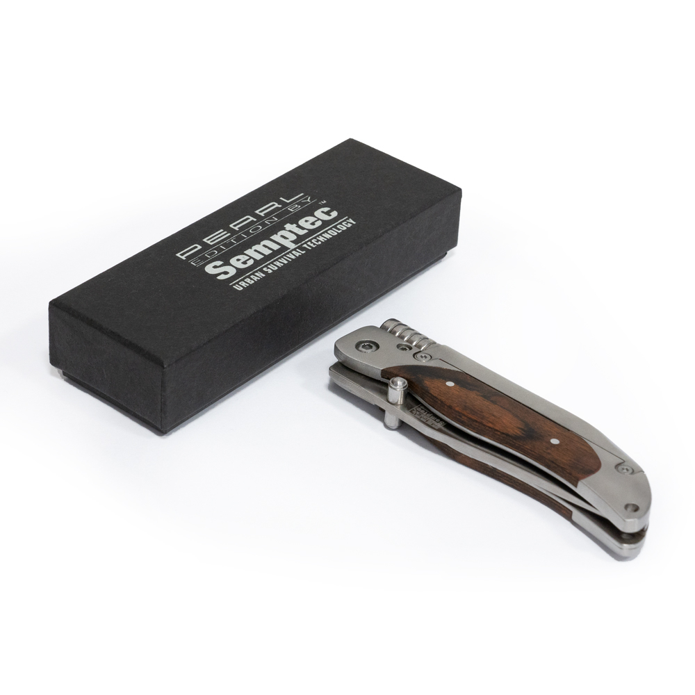 Neben der Aufbewahrung des Feuerstabes ist auch das Outdoormesser selbst sicher und handlich konzipiert. Der Griff aus wasserabweisendem Pakkaholz sorgt für einen guten Halt, ebenso bei nassen Händen. Zusätzlich verhindert die Klingenarretierung unbeabsichtigtes Einklappen der Schneide.