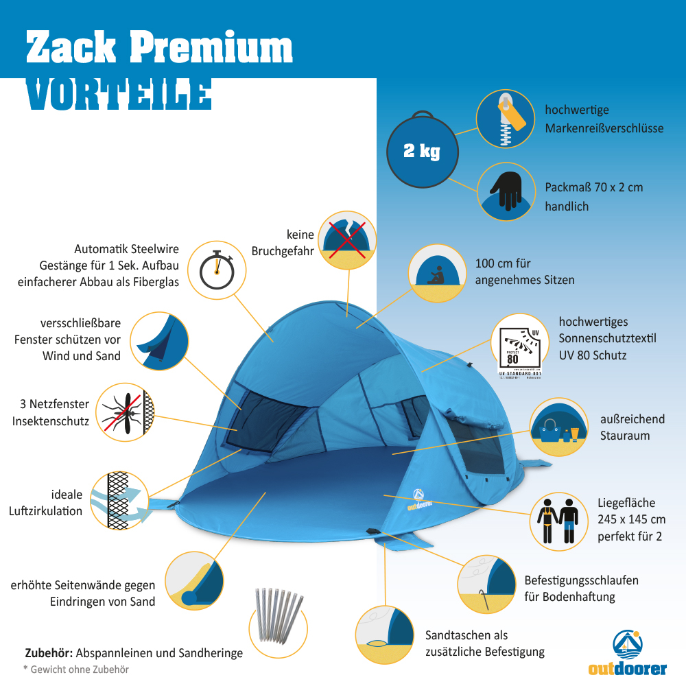 Die Strandmuschel Zack Premium ist die Weiterentwicklung unserer bekannten Pop-up Strandmuschel Zack II. Die Premium-Variante ist mit zusätzlichen Features ausgestattet, um deine Zeit am Strand für dich noch angenehmer zu gestalten. Sie ist ein Spitzenreiter was den Sonnenschutz angeht. Das Institut Hohenstein zertifizierte auch im Jahr 2017 den Faktor UV 80, nach dem Standard 801.