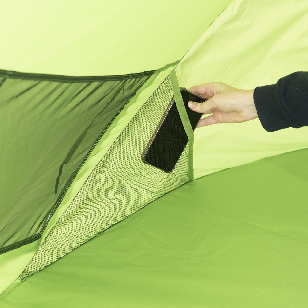 Das Strandzelt verfügt über eine praktische Aufhängeschlaufe im Dachbereich, mit der du bequem Lampen oder unseren 3-in-1 Ventilator befestigen kannst. So bleibt dein Strandplatz immer gut beleuchtet und angenehm belüftet – perfekt für heiße Tage und laue Abende.