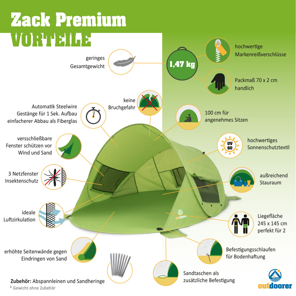 Das Highlight der Zack Premium sind ihre 3 Fenster, der besonders robuste Boden, ihr extra starkes Steel Wire Gestänge und die mitgelieferten Sandheringe. Dank der drei verschließbaren Fenster ist für eine gute Belüftung und Schatten gesorgt.