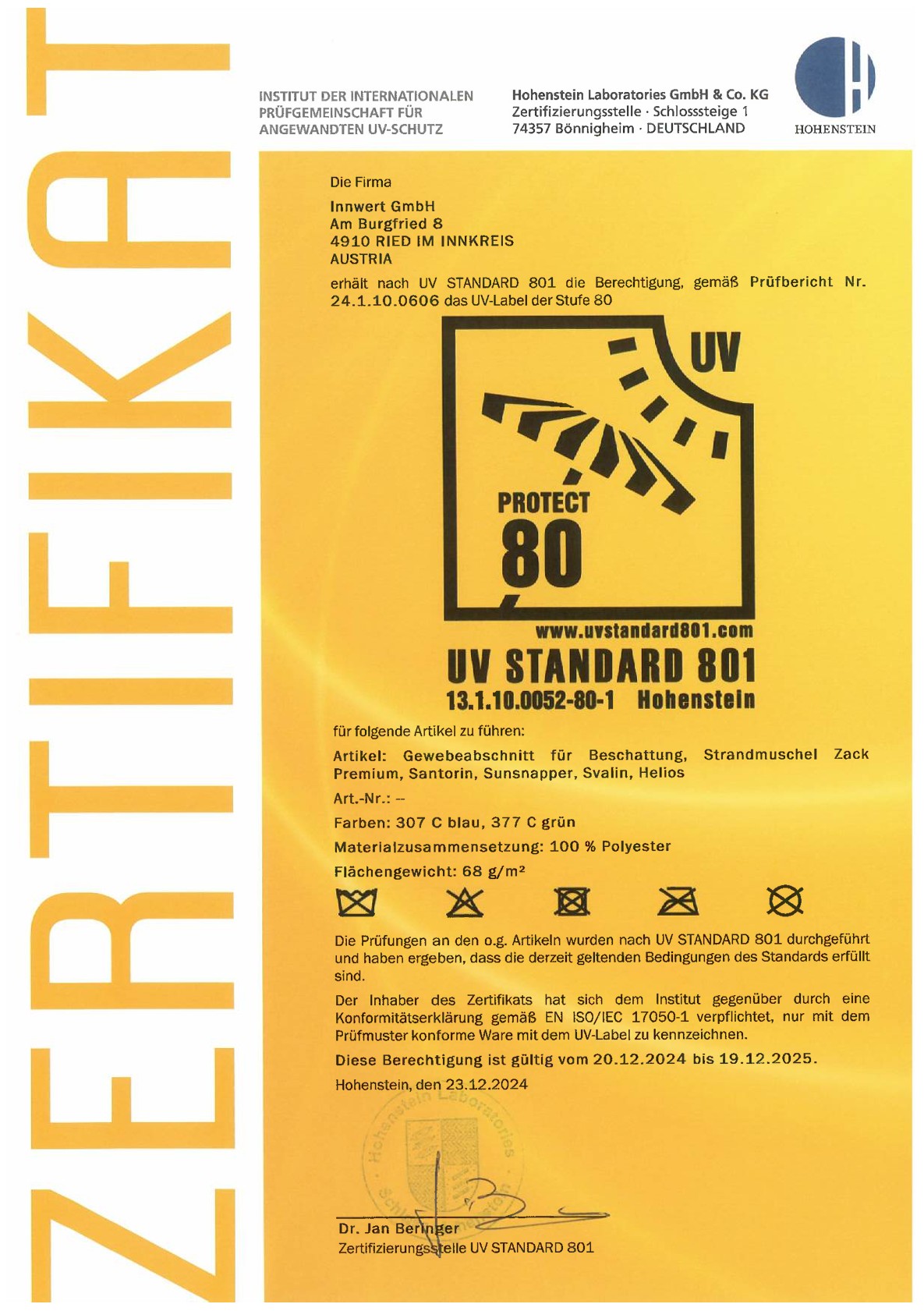 - Sonnenschutz: hoher UV Schutz Faktor von UV 80 nach Standard 801, zertifiziert durch das Institut Hohenstein