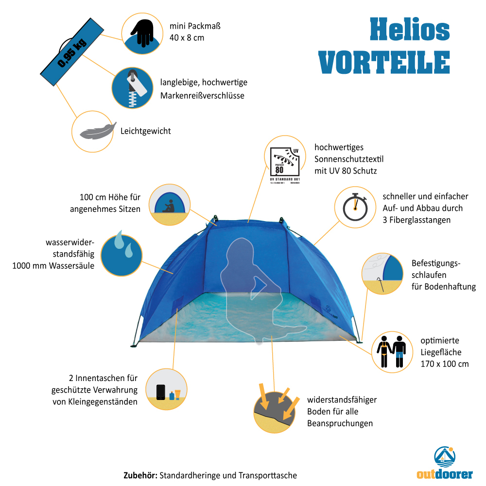 Die Reise-Strandmuschel Helios ist ideal, um einen herrlichen Tag am Strand in der Sonne alleine oder zu zweit zu genießen. Durch ihr extrem kleines Packmaß und ihr geringes Gewicht lässt sie sich problemlos transportieren und bietet zusätzlich einen hohen Lichtschutzfaktor von UV 80.