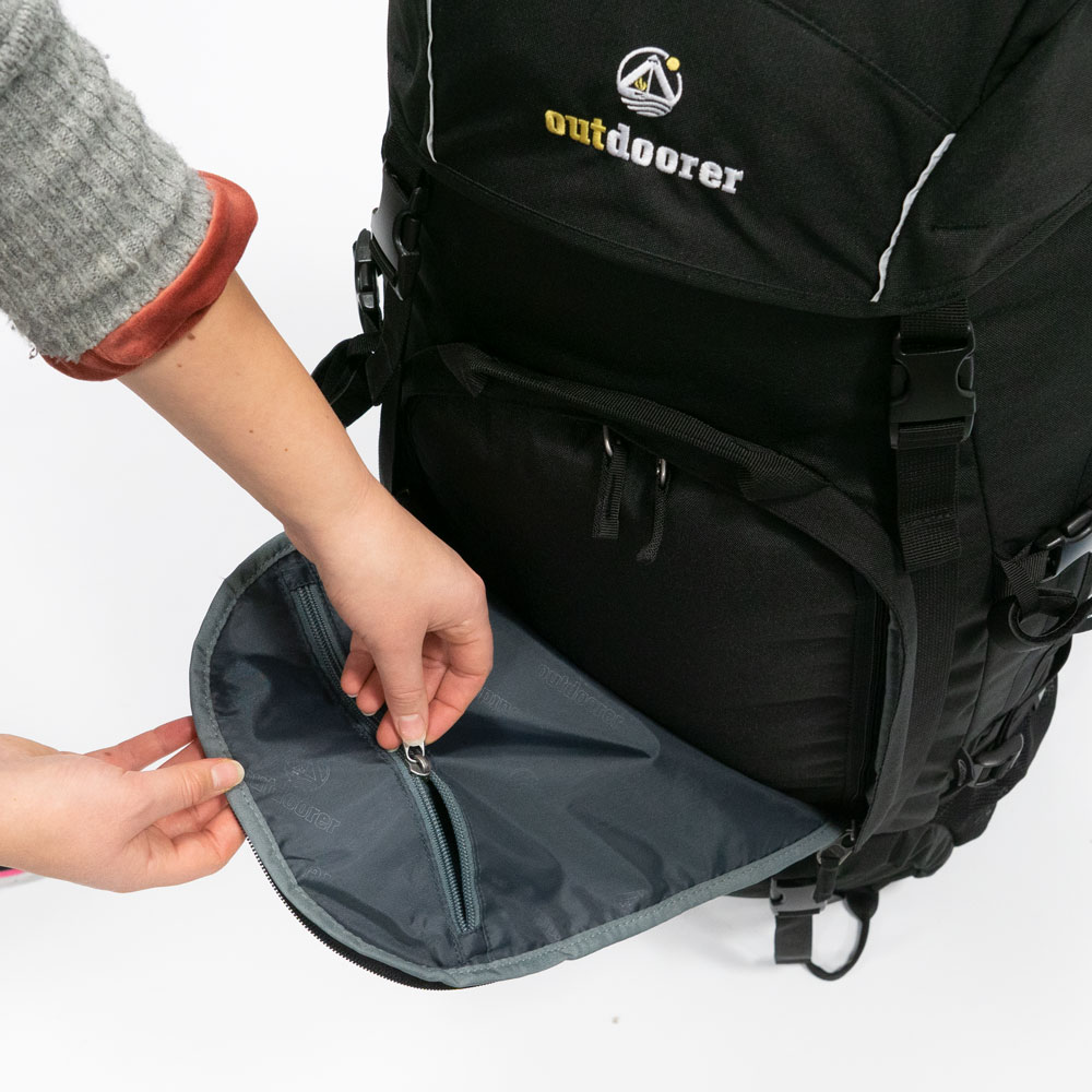 Das große Hauptfach des Reiserucksack Atlantis 90+10 von outdoorer kann bei Bedarf geteilt werden. Auf beide Teile kannst du per Frontzugriff zugreifen. Das ist besonders beim oberen, großen Fach von Vorteil. Du kannst schnell auf deine Kleidung und andere Gegenstände zugreifen.