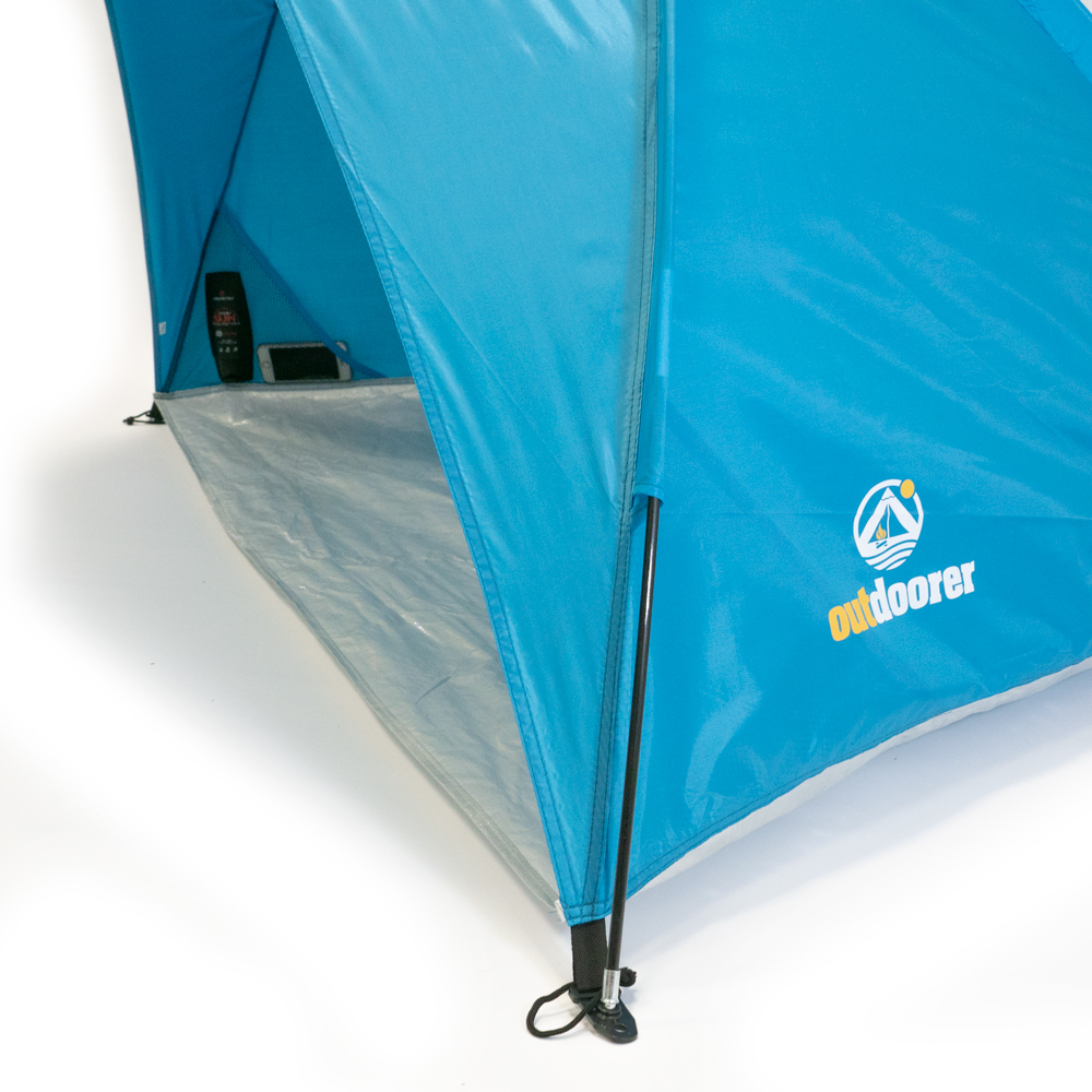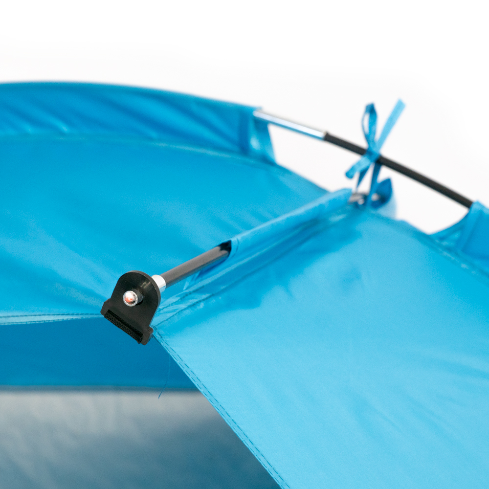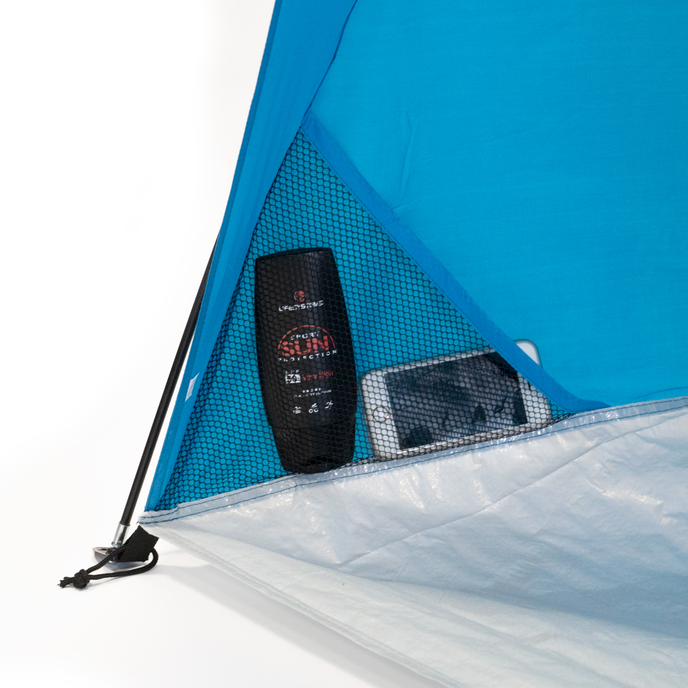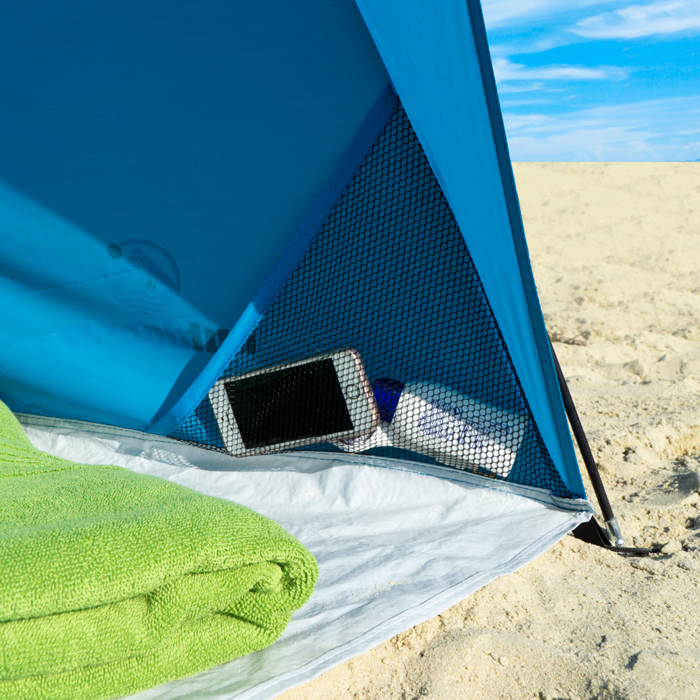 An der Innenseite sind bei diesem Strandzelt Mesh-Taschen angebracht, in denen Habseligkeiten verstaut werden können. Das Material verhindert, dass sich Sand darin sammelt und du somit ein unfreiwilliges Souvenir mit nachhause nehmen wirst. Zusätzlich bietet die Strandmuschel eine integrierte Aufhängeschlaufe, mit der du bei Bedarf einen kleinen Ventilator oder eine Lampe im Inneren befestigen kannst. So schaffst du dir auch unterwegs eine angenehme Luftzirkulation und etwas Licht, wenn die Sonne langsam untergeht.