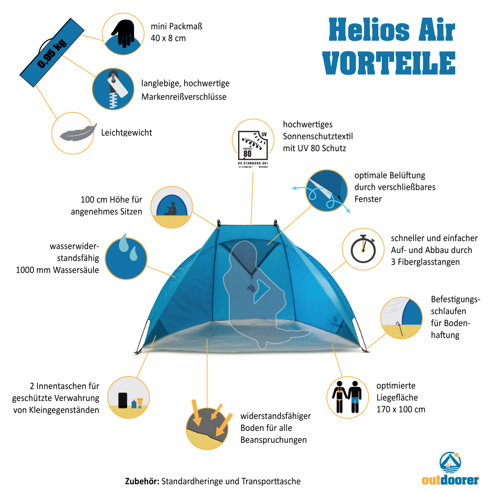 Schnell und einfach aufgebaut zeigt sie jedoch wahre Größe: 170 x 100 x 100 cm - ausreichend Platz für 1-2 Personen. Die Höhe von 100 cm ermöglicht bequemes Sitzen; allein oder zu zweit, am Meer oder See, lesend oder einfach entspannend, immer jedoch geschützt vor schädlicher UV-Strahlung. Denn die bedeutenden Hohenstein-Institute bestätigten den höchstmöglich zertifizierbaren UV 80-Schutz nach UV Standard 801 des Sonnenzelts Helios Air. Anders als der Name vermuten lässt, ist es hier ein wahres Schwergewicht.