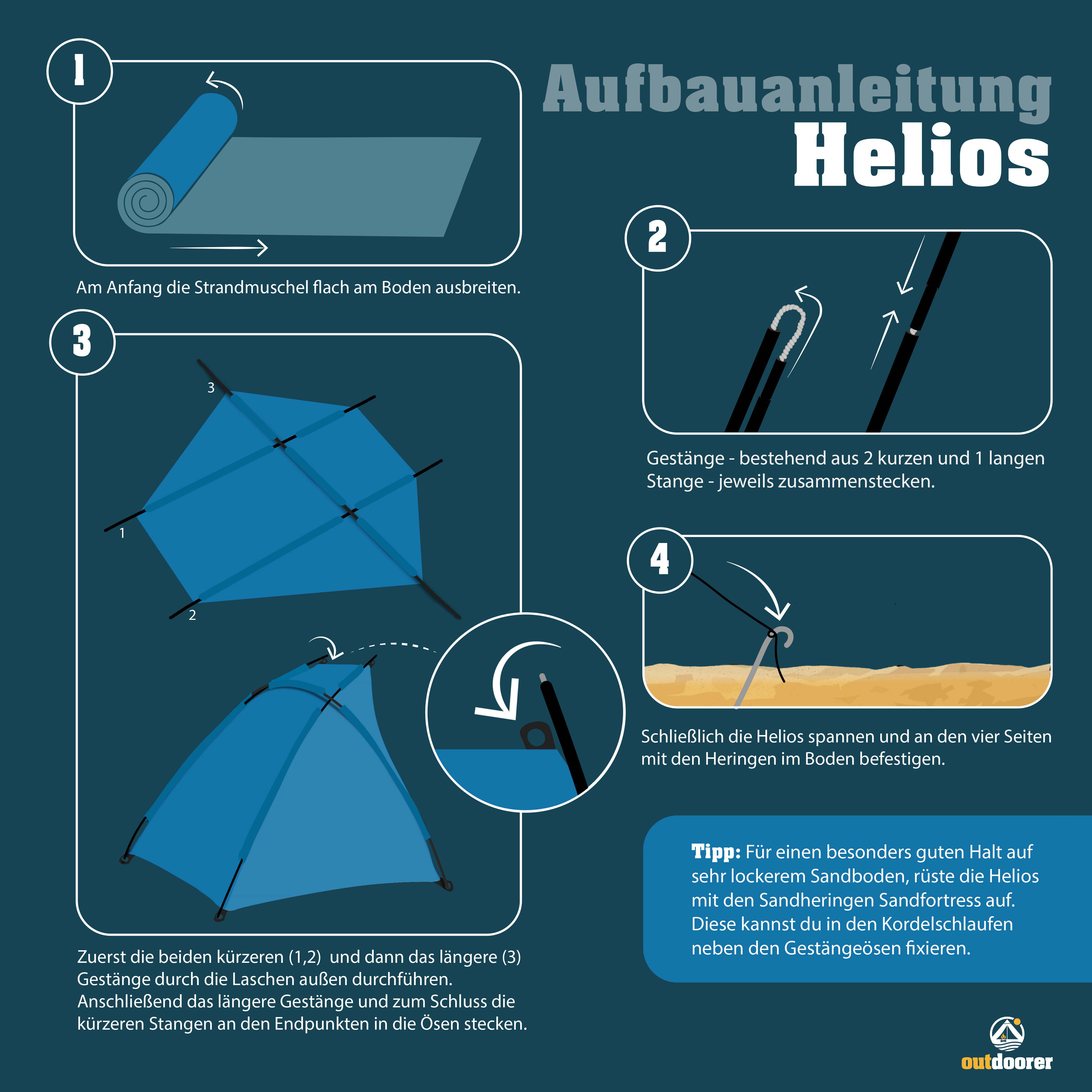 Nie wieder schweres Herumschleppen von Sonnenschutz, nie wieder Sperrgepäck, nie wieder Sonnenbrand am Strand! Bei der Helios Air 850 ist der Name Programm. Die Zahl steht für die ultraleichten 850 g dieser Reisestrandmuschel, ermöglicht durch hochwertiges Aluminiumgestänge. Doch nicht nur das äußerst geringe Gewicht wird durch das Air im Namen verdeutlicht. Air steht auch für ideale Belüftung durch ein verschließbares Netzfenster und die "Flugfähigkeit" der Strandmuschel - denn dank Minipackmaß (40 x 8 x 8 cm) kann diese im Koffer und somit Flugzeug transportiert werden. Dabei seid ihr weltweit vor schädlichen UV-Strahlen, Wind und fremden Blicken geschützt - und nehmt sie im Gepäck dabei kaum wahr! Leicht, leichter, Helios Air 850! Dank Aluminiumgestänge ist diese Reisestrandmuschel von outdoorer ein wahres Federgewicht. Zusammen mit dem Minipackmaß kann sie weltweit einfach im Koffer transportiert werden, um euch dank extrem hohem UV 80-Sonnenschutz vor Strahlen zu schützen! Technische Facts - Ultraleichte Reisestrandmuschel Helios Air 850: Dimensionen: 170 x 100 x 100 cm Gewicht: ultraleichte 850 g Passt in jeden Koffer: 40 x 8 x 8 cm - Minipackmaß Platz für 1-2 Personen Material Strandmuschel: hochwertiges Lumotex 80 Material Boden: robustes PE Gestänge: extrem leichtes Aluminiumgestänge Gestängeeinfassungen: Oxford Polyester Verschließbares Netzfenster für optimale Belüftung Äußerst hoher Sonnenschutz UV 80 nach UV STANDARD 801 Meshtaschen zur Aufbewahrung von Gegenständen Praktische Aufhängeschlaufe zur Befestigung von Lampe oder Ventilator Laschen für Sandheringe Zubehör: Transporttasche, Abspannleine, Standardheringe Reisestrandmuschel mit Minipackmaß Strandtuch, Kühltasche mit Verpflegung, Volleyball, Sonnenschirm, Liege ... für manche Wege zum Strand ließe sich beinahe ein Umzugsunternehmen beauftragen. Die Reisestrandmuschel Helios Air 850 ist die ultraleichte Alternative zu sperrigen Strandutensilien: Mit einem Minipackmaß von nur 40 x 8 x 8 cm kann sie im Gegensatz zu Sonnenschirm und Liege lässig über der Schulter transportiert werden - so spart ihr Platz und Schweiß. Ultraleichte Strandmuschel für 1-2 Personen Sogar eure Kinder können sie spielend leicht tragen, da sie nur 850 g wiegt! Zudem passt sie so in jeden Koffer - sogar im Flugzeug-Handgepäck (Heringe ausgenommen) kann die kleine Strandmuschel verstaut werden. Wobei "klein" das falsche Wort ist - schnell und mühelos aufgebaut ist das Sonnenzelt ein wahres Platzwunder. Mit einer Liegefläche von 170 x 100 cm und einer Sitzhöhe von 100 cm bietet sie 1-2 Personen bequem Platz. Selbst Habseligkeiten finden darin noch Platz, diese können in seitlich angebrachten Taschen bequem verstaut werden. Diese bestehen aus Mesh - so wird verhindert, dass sich Sand darin verfängt und ihr unfreiwillige, feinkörnige Souvenirs mit nach Hause nehmt. Maximaler Sonnenschutz: UV 80-Sonnenzelt mit Fenster Doch selbst "voll ausgelastet" staut sich in dem Sonnenzelt die Luft kaum. Ein verschließbares Netzfenster sorgt für ideale Belüftung - der Sonnenschutz bleibt dabei garantiert. Dieser könnte höher nicht sein: Die renommierten Hohenstein Institute haben UV 80-Schutz nach UV STANDARD 801 zertifiziert. So seid ihr weltweit vor schädlichen UV-Strahlen geschützt. Höchste Stabilität und leichtestes Gewicht dank Aluminiumgestänge Doch nicht nur vor Sonne, auch vor Wind seid ihr im Strandzelt Helios Air 850 sicher. Das extrem robuste Lumotex 80- Material und der PE-Boden werden vom ultraleichten Alumiumgestänge stabilisiert. Durch dieses zählt die Reisestrandmuschel zu den hochwertigsten ihrer Kategorie, da sich Aluminiumgestänge nicht nur durch ultraleichtes Gewicht, sondern auch extreme Robustheit, Beständigkeit und Stabilität auszeichnet. Zudem splittert es nicht. Mit widerstandsfähigen Gestängeeinfassungen aus Oxford Polyester wird die Reisestrandmuschel so zum idealen Windschutz. Für Windspitzen empfehlen wir die im Lieferumfang enthaltene Abspannleine und Heringe. Bei besonders feinkörnigem Sand können Sandheringe Sandfortress verwendet werden. Für diese sind separate Laschen angebracht. Reisestrandmuschel für Strände und Trekkingtouren weltweit Auch vor all zu neugierigen Blicken seid ihr in der Reisestrandmuschel bestens geschützt. So wird diese zum idealen Begleiter weltweit. Doch natürlich kann das Sonnenzelt mit UV 80-Schutz nicht nur am Meer eingesetzt werden. Auch bei Trekkingtouren, Campingausflügen, Tagen am See oder im heimischen Garten bietet es (ultra)leicht zu transportierenden Sicht-, Wind- und Sonnenschutz. Kompakte Strandmuschel mit Aufhängeschlaufe Die Helios Air 850 bietet eine integrierte Aufhängeschlaufe, mit der du bei Bedarf einen kleinen Ventilator oder eine Lampe im Inneren befestigen kannst. So schaffst du dir auch unterwegs eine angenehme Luftzirkulation und etwas Licht, wenn die Sonne langsam untergeht. Praktisch, durchdacht und ideal für warme Tage am Wasser oder auf Reisen. Einfacher Aufbau der Helios Air 850 in 5 Schritten {{widget type="xonu_widgets/youtube" src="https://www.youtube.com/embed/" fullwidth="1" allowfullscreen="1" allow="accelerometer; autoplay; clipboard-write; encrypted-media; gyroscope; picture-in-picture" showcontrols="1" privacymode="1" lazyloader="1"}}