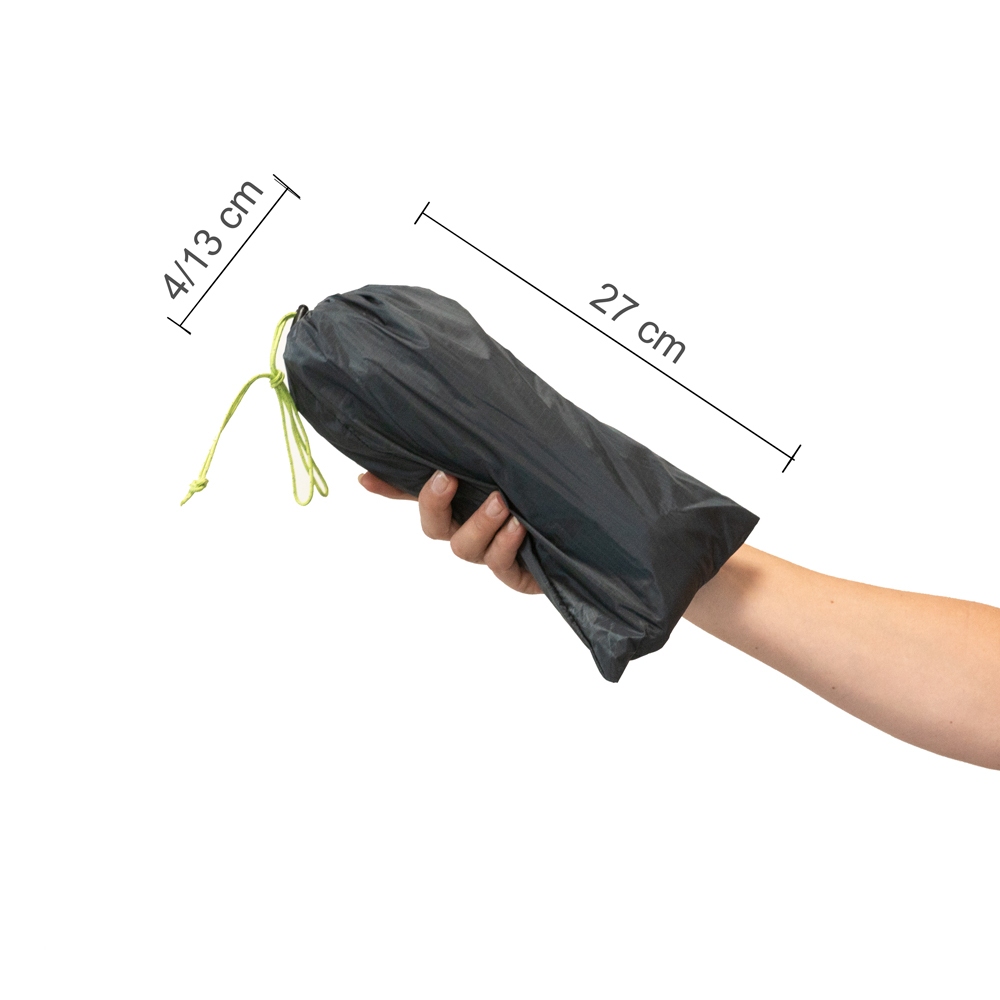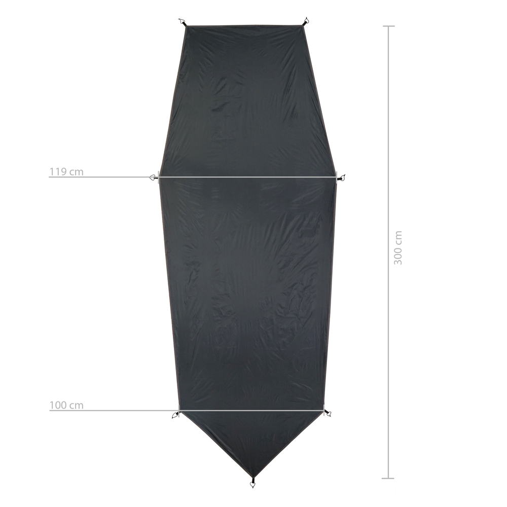 Trotz widerstandsfähigem Material und der Größe von 300 x 119/100 cm weist die trapezförmige Zeltunterlage ein äußerst geringes Packmaß von 27 x 4 x 13 cm und ein minimales Gewicht von 295 g auf.