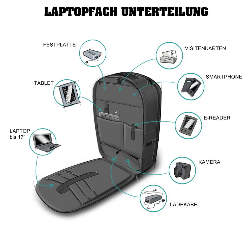 Der Digital Nomad 35 als Rucksack mit vielen Fächern bietet unzählige Organisationsmöglichkeiten. Unterwegs arbeiten zu können ist für Digitale Nomaden unerlässlich und dieser Laptop Rucksack erfüllt alle Ansprüche, um maximale Flexibilität und Mobilität zu gewährleisten. Das große Hauptfach für Kleidung ist abtrennbar. Da die Flexibilität Digitaler Nomaden erheblich eingeschränkt wäre, wenn sie ihr Büro ständig mit sich herumschleppen müssten, haben wir das innovative PACK OFFICE entwickelt. Dieses besteht aus dem DIPO-Fach und der E-VARI-Box. Das gepolsterte DIPO (= DIgital POwer)-Laptopfach am Rücken bietet Platz für bis zu 3 Laptops mit maximal 13, 15,6 und 17 Zoll und 2 Tablets mit bis zu 7,9 und 9,7 Zoll. Zusätzlich kann vom Laptopfach und Hauptfach auf die E-VARI (= Elektronisch-VARIabe)-Unterteilung für Tablet, Kamera, Drohne, E-Reader, Ladekabel, Smartphone, Festplatte und Visitenkarten zugegriffen werden. Diese kann - ganz variabel - in das Hauptfach integriert werden, um dort noch mehr Platz zu bieten. Das verdeckte Frontfach ist dafür gedacht, Reiseunterlagen, Schlüssel, Kopfhörer, Pass und andere Gegenstände, die schnell 'bei der Hand' sein müssen, unterbringen zu können. Geschützt wird dieser Business Rucksack bei stärkeren Regenschauern durch eine integrierte Regenhülle, wenn das wasserabweisende Material des Rucksacks nicht mehr ausreicht. Alle Fächer sind mit hochwertigen Marken-Reißverschlüssen versehen, Haupt- und Laptopfach lassen sich - beispielsweise mit einem TSA Schloss - absperren, was zusätzliche Sicherheit unterwegs gewährleistet.