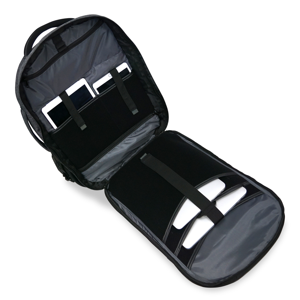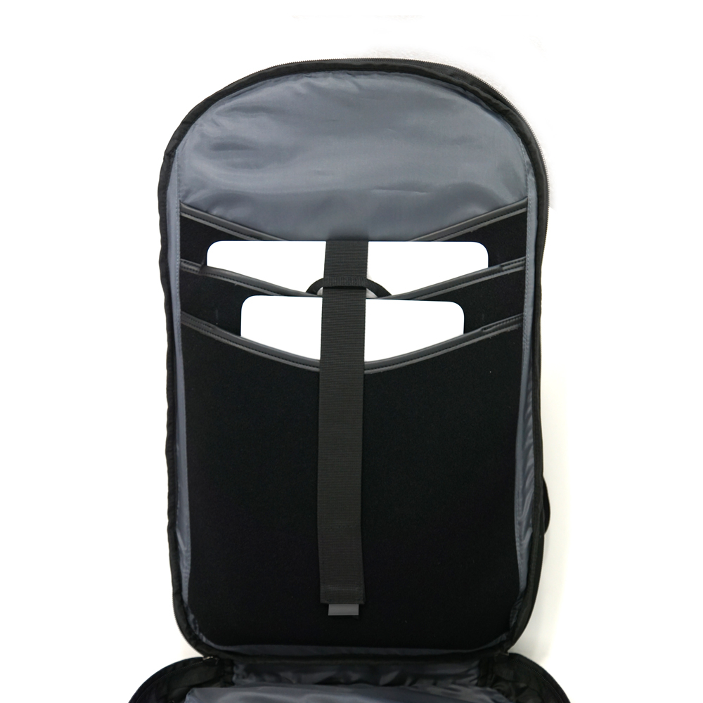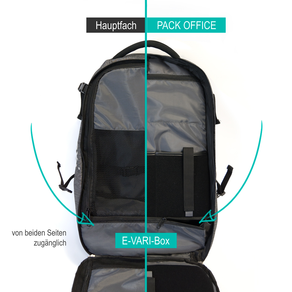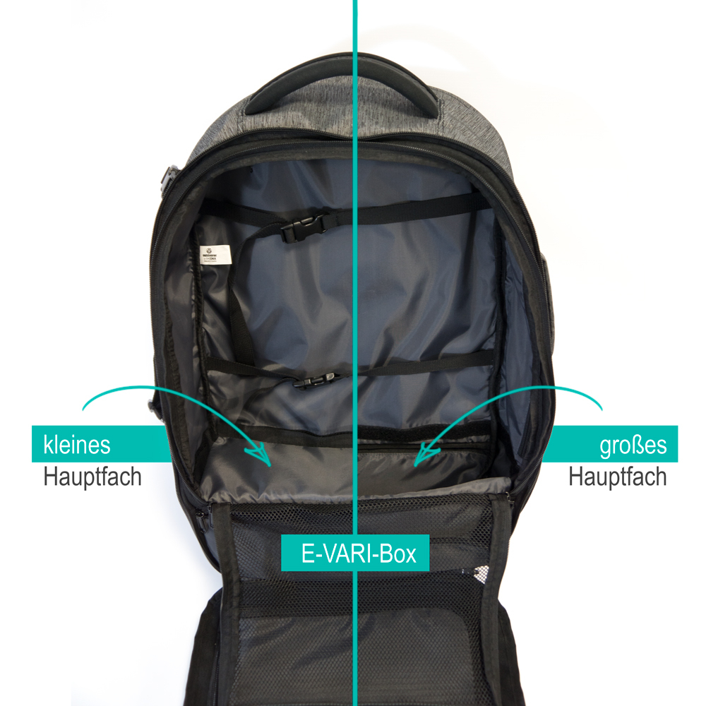 - In Hauptfach integrierbares E-VARI-Staufach für elektronische Geräte, Kamera, Ladekabel, etc.