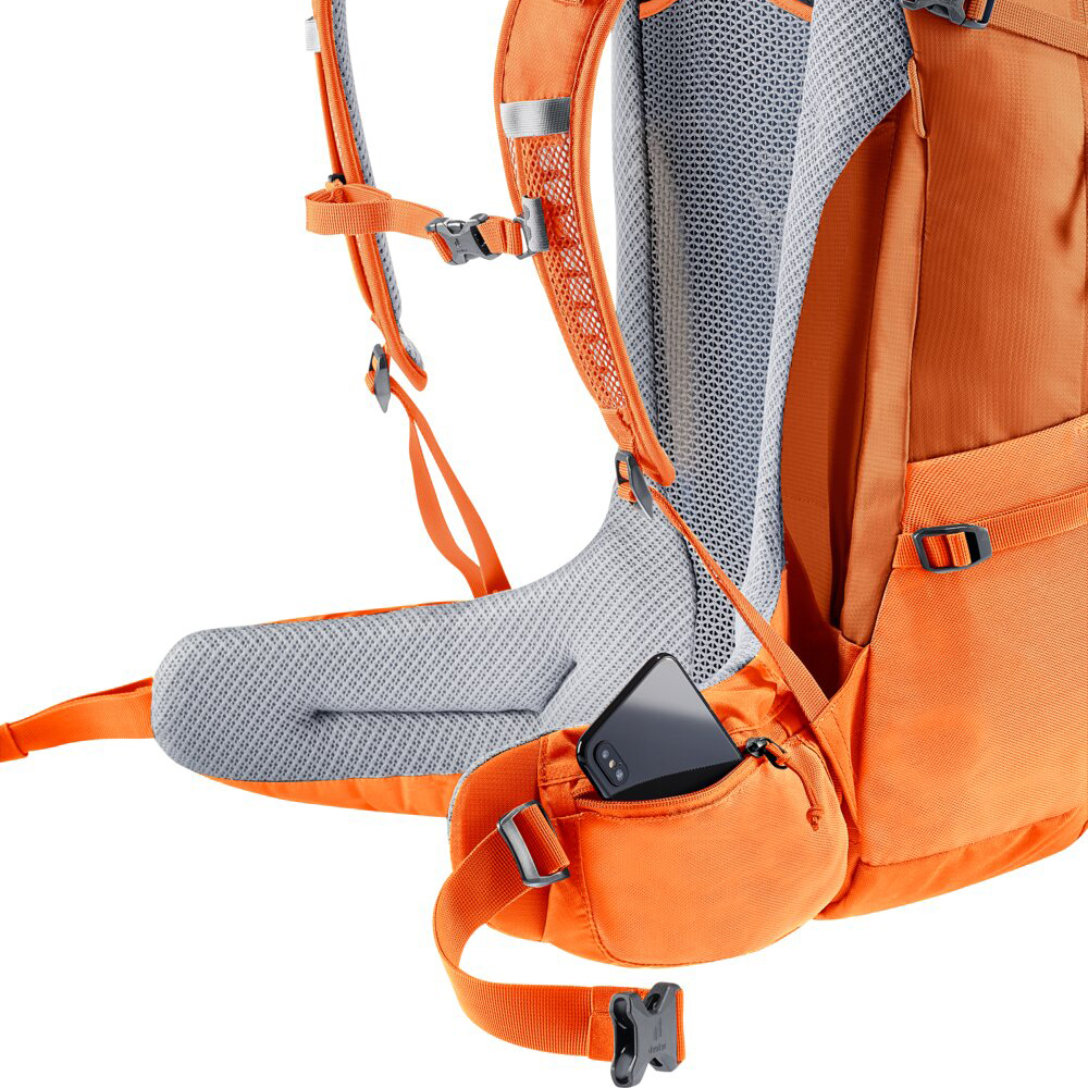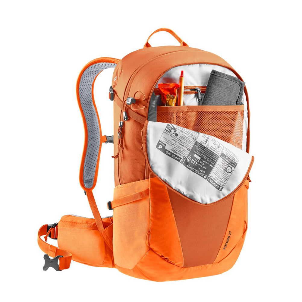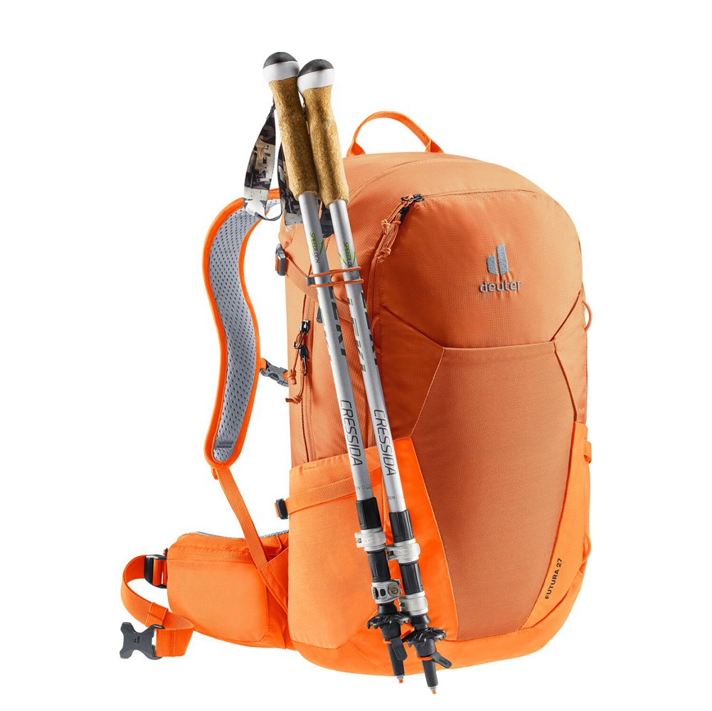 Platz intelligent nutzen – genau diese Aussage ist zutreffend, wenn es um den Deuter Wanderrucksack Futura 27 geht. Ein geräumiges Hauptfach bietet viel Platz für deine Sachen. Im separaten Innenfach, welches für ein Trinksystem von bis zu drei Litern geeignet ist, lässt sich bei Bedarf auch ein Laptop platzieren. Das abgetrennte Bodenfach von diesem Deuter Reiserucksack kann z.B für Schmutzwäsche verwendet werden und ist von außen leicht zugänglich. Die elastischen Seitentaschen bieten viel extra Platz für eine Wasserflasche, usw. und an der Wanderstockhalterung kannst du bequem deine Trekkingstöcke platzieren. Dank dem Organiser in der Vortasche bleibt dein Notepad, Kugelschreiber, usw. immer griffbereit, wenn es mal etwas zu notieren gibt. Wenn du zwischendurch ein Eis oder einen Snack kaufen möchtest, musst du nicht lange im Rucksack graben - lege dein Kleingeld einfach in die Reißverschlusstaschen an den Hüftflossen. Deine Wertsachen finden in der geräumigen Innentasche gut Platz.