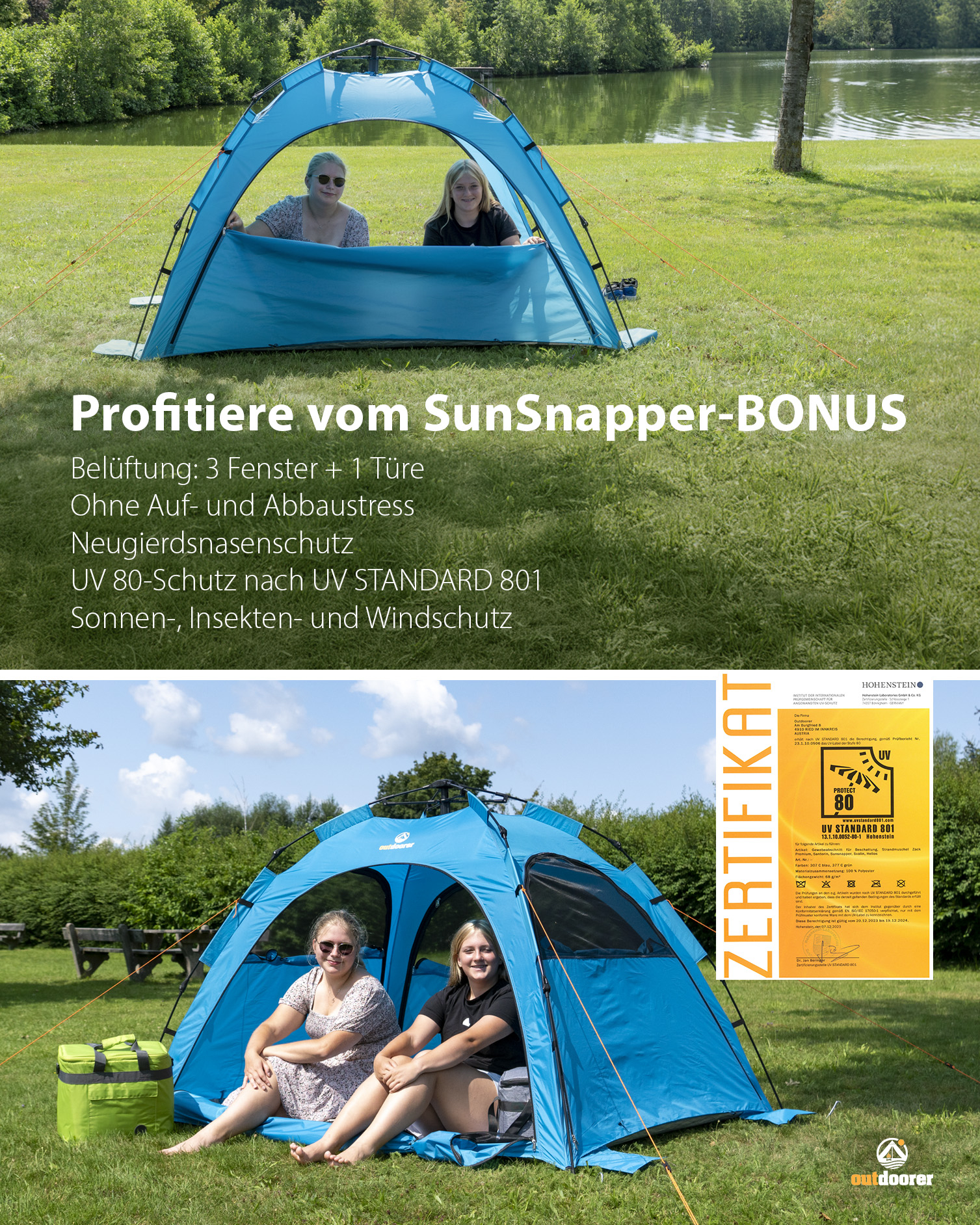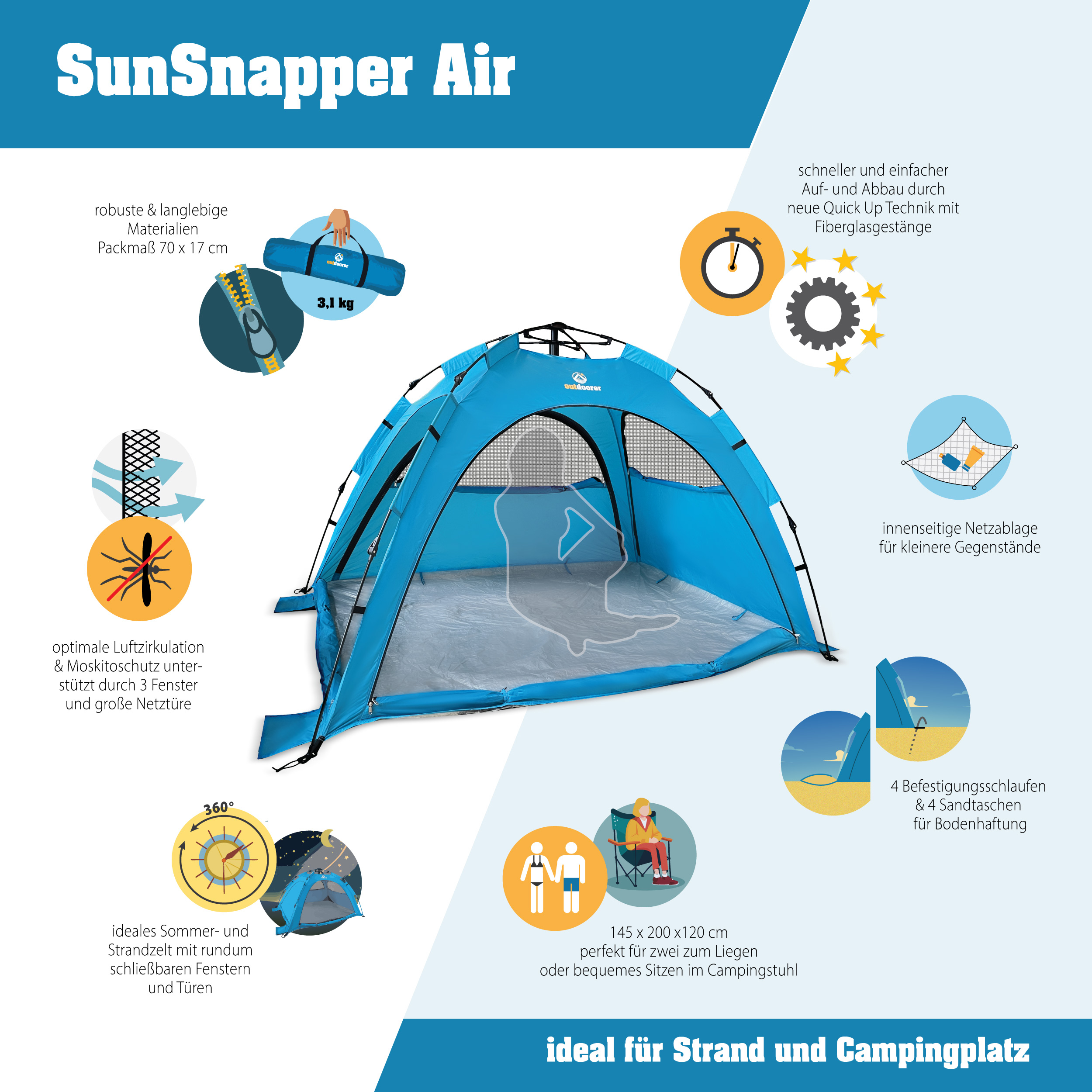 Unser SunSnapper Air ist dein idealer Begleiter beim Urlaub am Strand mit Kindern! Er überzeugt neben Insekten-, Sicht-, Wind- und Sonnenschutz, idealer Belüftung und XXL-Abmessungen trotz leichtem Gewicht vor allem durch seinen ausgeklügelten Schnellaufbau-Mechanismus. Das Strandzelt mit UV-Schutz 80 ist in 5 Sekunden aufgebaut – und in unter 20 Sekunden wieder bereit, in der kleinen, praktischen Transporttasche verstaut zu werden.