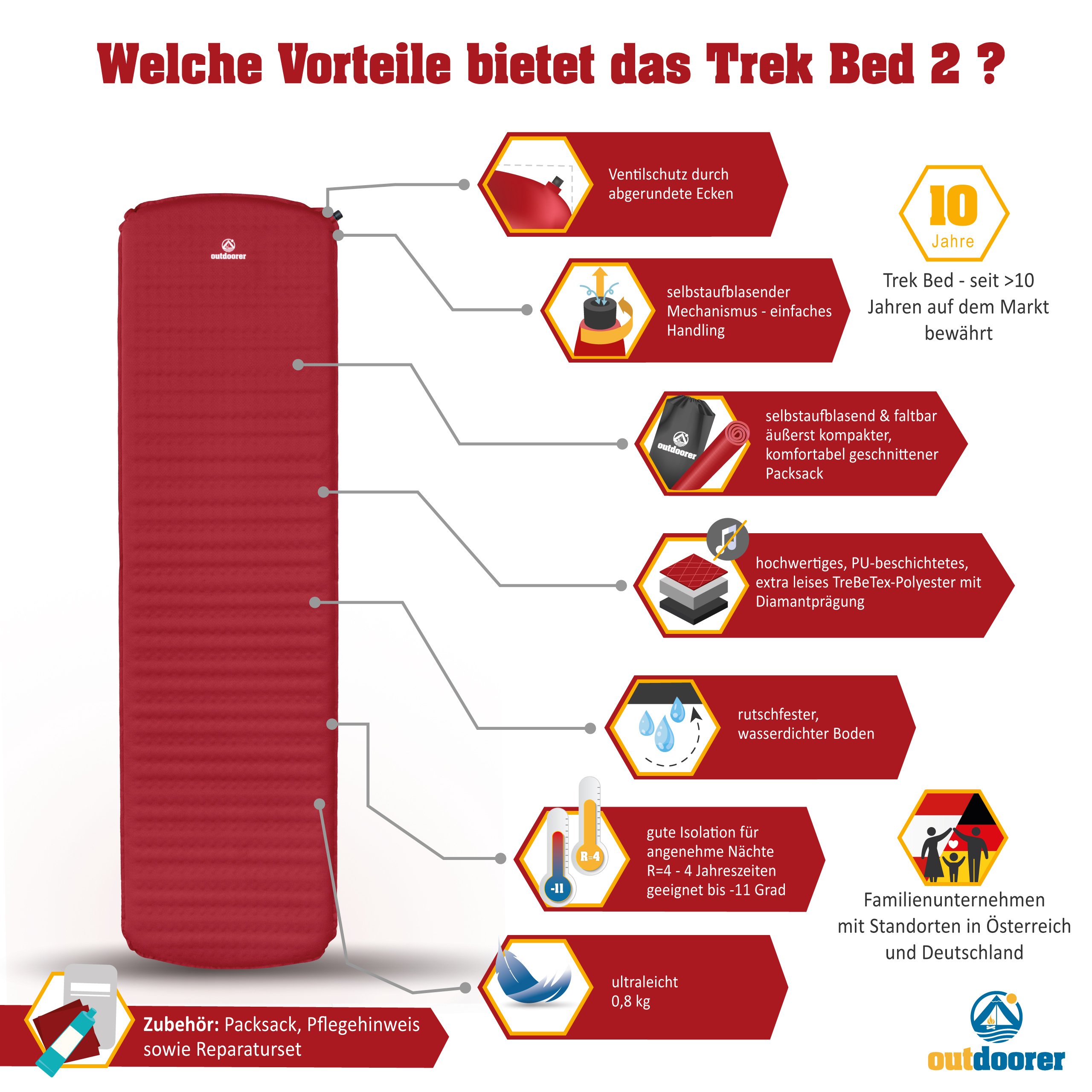 Produktinformationen "Trek Bed 2 in Rot, ultraleichte selbstaufblasende Isomatte, kleines Packmaß"