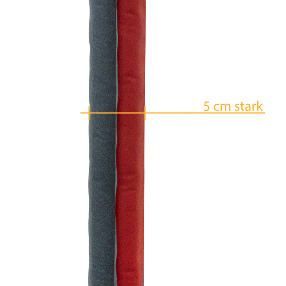 Die Ecken des Trek Bed 2 wurden nicht nur aus optischen Gründen abgerundet, sie haben auch einen praktischen Nutzen. Das Ventil wird dadurch nicht beschädigt wenn mehrere Matten nebeneinander liegen. Der Schaumstoff der Matte ist horizontal und vertikal gestanzt, somit lässt sie sich nach dem Gebrauch leicht einrollen und bequem im Transportbeutel verstauen. Auf die Wärmeisolation wirken sich die Stanzungen nicht negativ auf. Der R-Wert wird mit 4 angegeben. Das besagt, dass du die Matte ganzjährig bis zu einer Temperatur von -11 Grad einsetzen kannst, obwohl diese selbstaufblasende Isomatte ultraleicht ist.