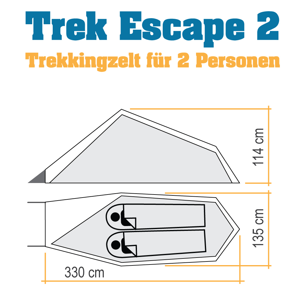 Das Trekkingzelt Trek Escape 2 ist ein ultraleichtes Trekkingzelt für 2 Personen. Du kannst das 4-Jahreszeiten-Zelt auch im Winter bei Schnee verwenden. Durch sein extrem kleines Packmaß und sein geringes Gewicht eignet es sich für anspruchsvolle Touren zu Fuß, mit dem Rad, Kajak, Kanu oder auch für Motorradtouren.
