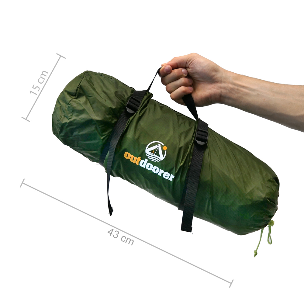 - Außenzelt: ultraleichtes Nylon Ripstop, Oberfläche silikoniert, UV beständig, 2.000 mm Wassersäule