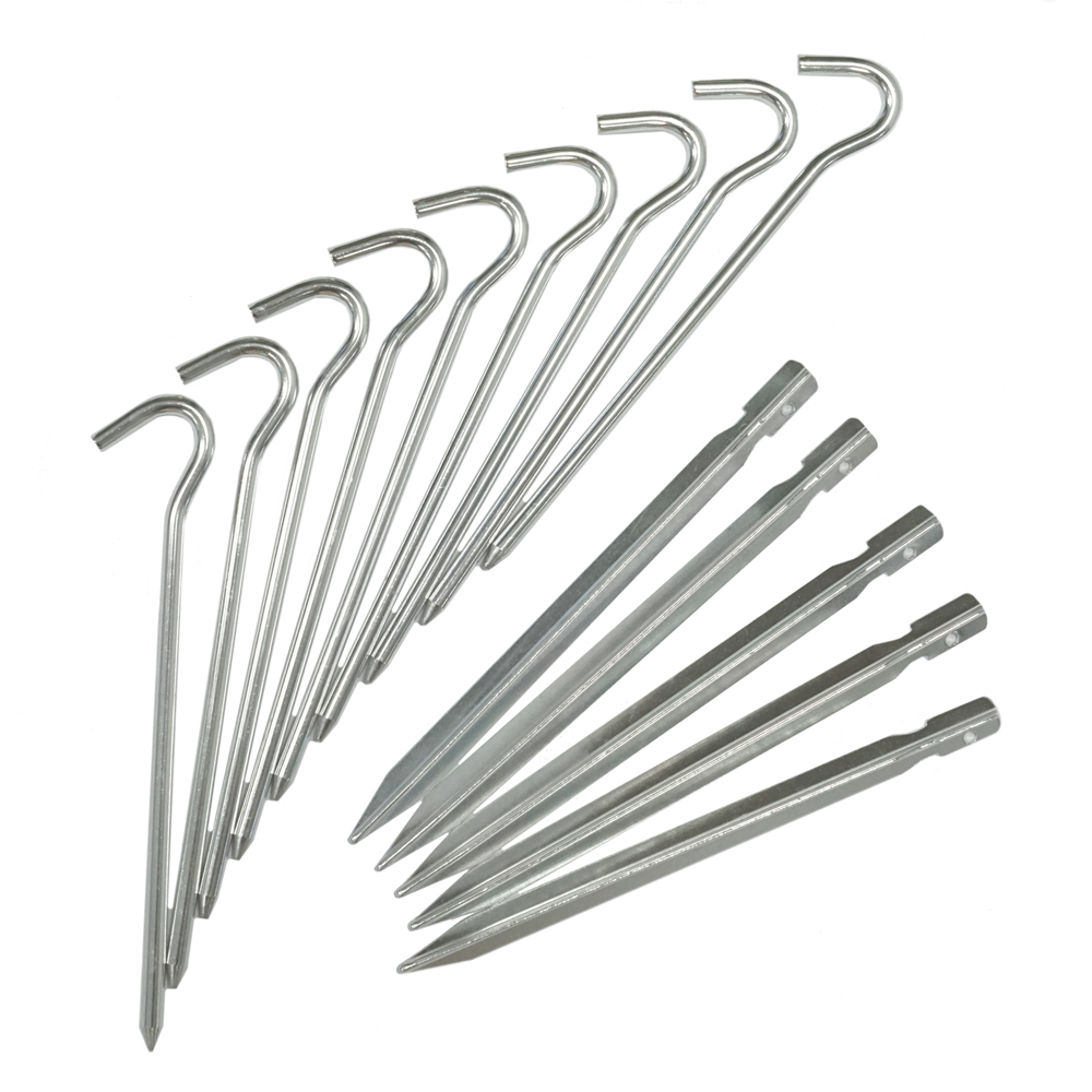Die mitgelieferten normalen Heringe zum Abspannen und Y-Heringe zur Befestigung des Bodens sind zu Gunsten des Gewichts aus Alu. D.h. sie verbiegen sich schnell, man muss beim Reinschlagen mit Steinen o.Ä. ein bisschen vorsichtiger zu Werke gehen. Halten aber perfekt, auch auf schwierigen Untergründen wie z.B. Kiesbänken am Fluss oder hochalpinem Steinboden.
