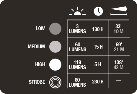 3 | Maximum (118 Lumen) | 42 m | 5 h |