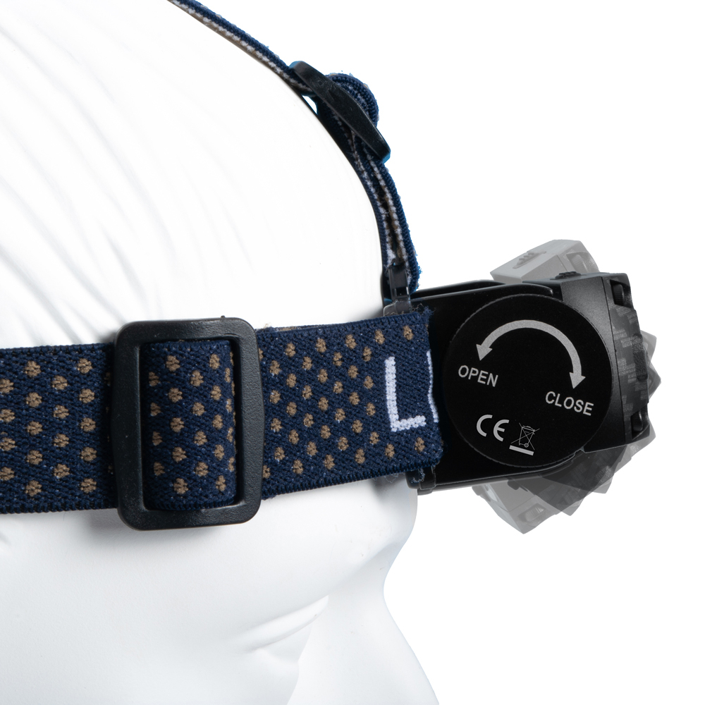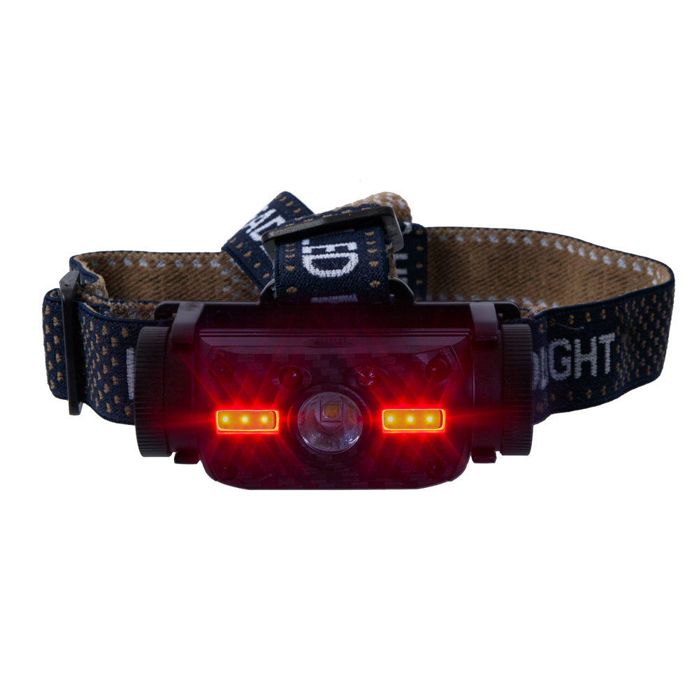 Erfreue dich an hoher Flexibilität, auch abseits des um 180° verstellbaren Leuchtkopfs. Mit dem Knopf der Lampe kannst du zwischen fünf verschiedenen Leuchtstufen und zwei verschiedenen Leuchtmodi wählen. Die Hauptlampe erstrahlt im weißen Licht und lässt sich in drei Stufen variieren – leichte, mittlere oder hohe Leuchtintensität. Die beiden Nebenlampen können sowohl weiß als auch rot strahlen und blinken und lassen sich zwischen hoher beziehungsweise niedriger Leuchtintensität verstellen. Um gesehen zu werden, kannst du bei der LED Stirnlampe auch eine der beiden Leuchtstufen Signallicht und SOS-Licht einstellen.