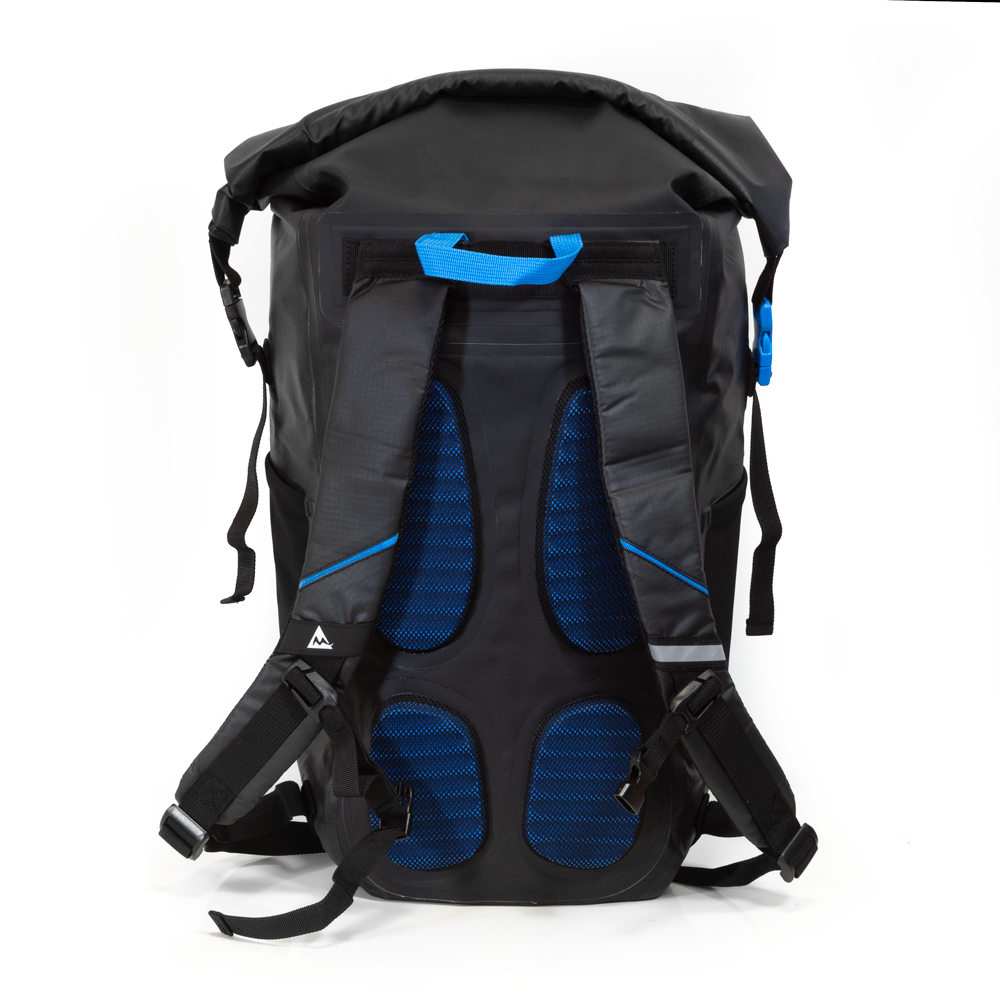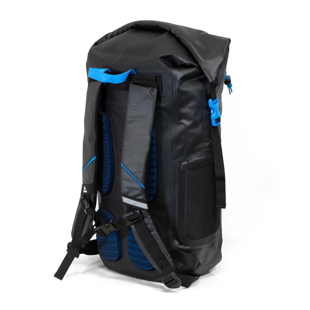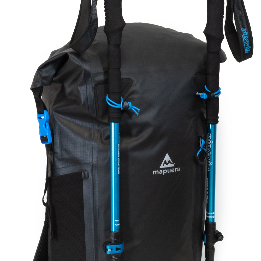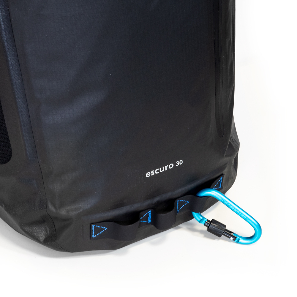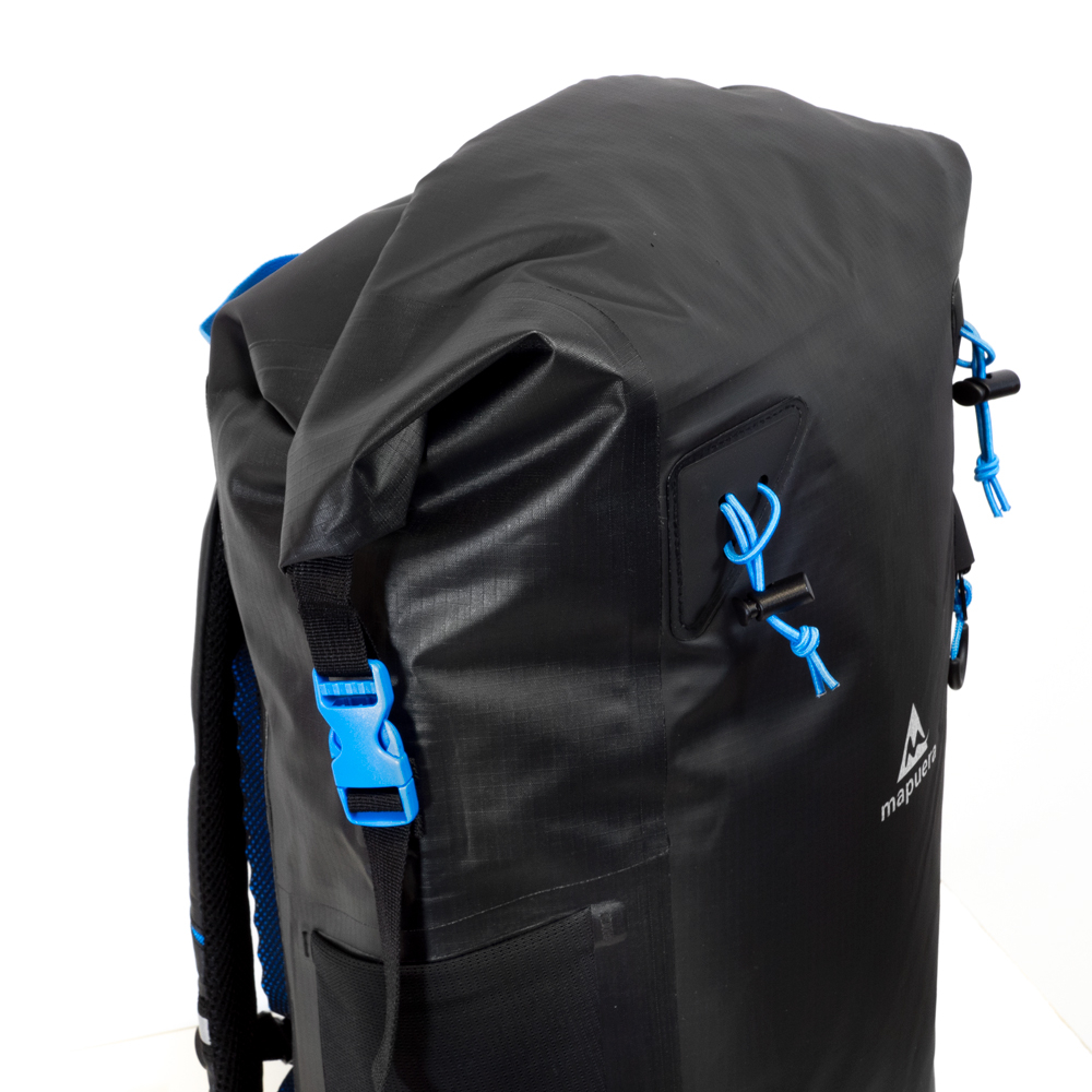 Wie alle Backpacks aus der Escuro Reihe von mapuera ist auch dieser Rucksack sehr bequem zu tragen. Der wasserdichte Rucksack ist ergonomisch und hat keine unnötigen Schlaufen, die dich bei den Bewegungen einschränken könnten. Sollte es mal weniger Equipment sein, so lässt sich der Brustgurt einfach abnehmen. Stilvolle Mesheinlagen in Blau helfen, Schweißbildung zu vermeiden. Das elastische, schwarze Gurtband hält die Form des Rucksacks stabil und mittels blauen Tragegriffes lässt sich der Rucksack bequem hochheben.