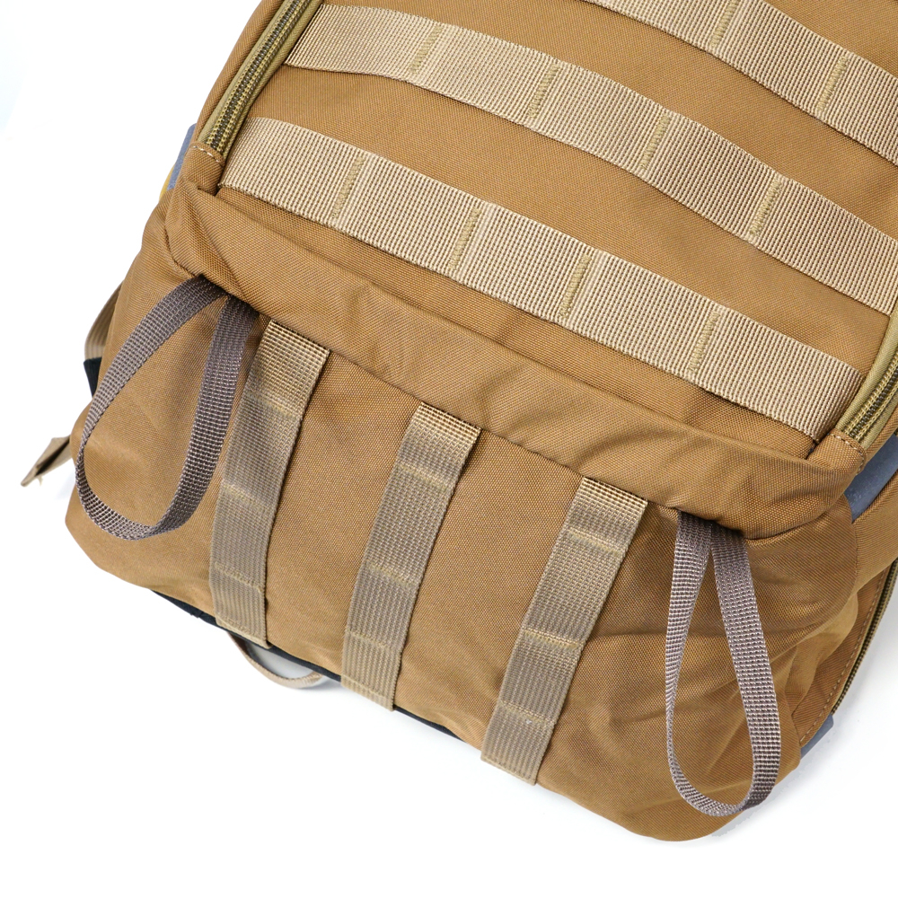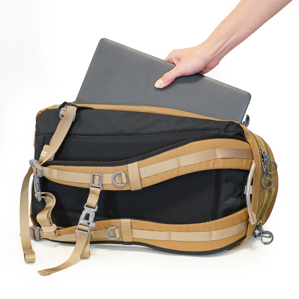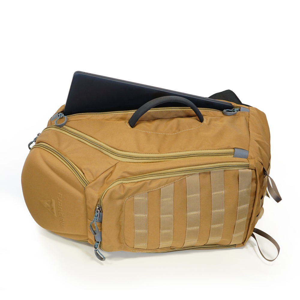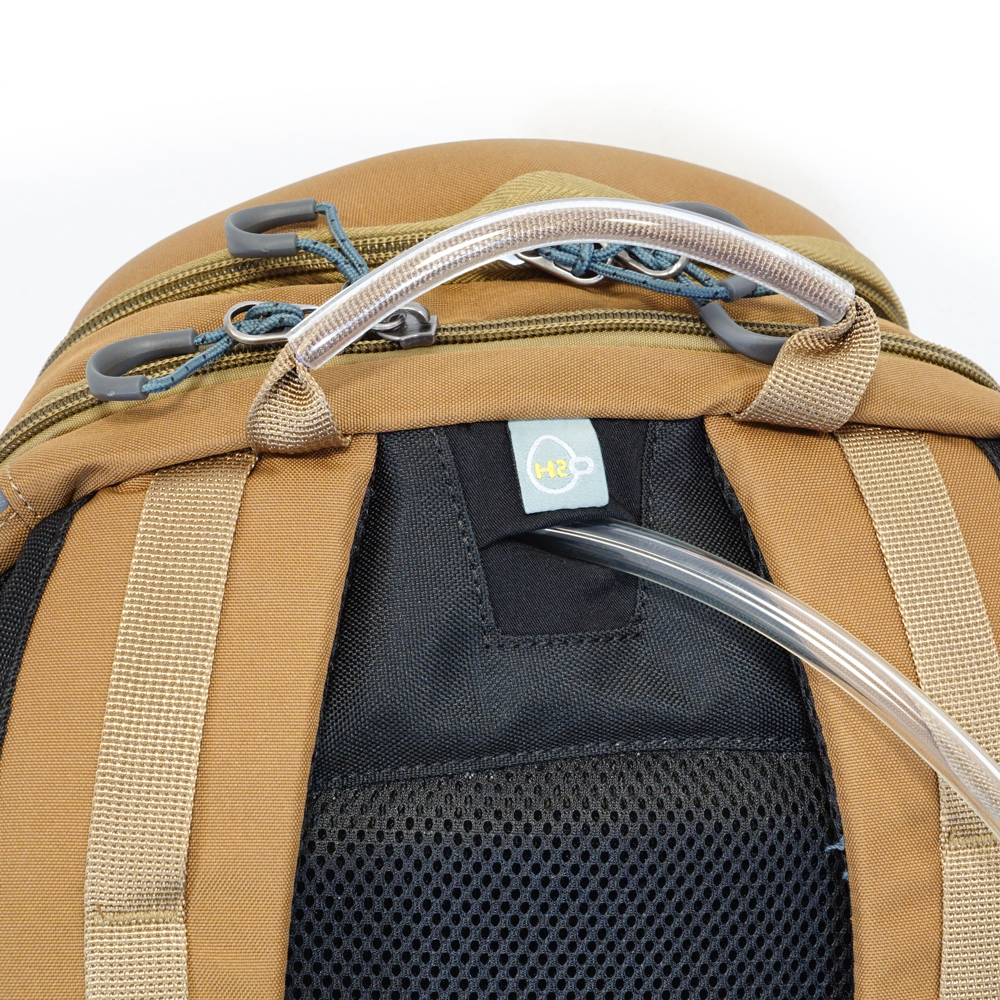 Die Zahlreichen Einhängelaschen an der Front bieten dir genügend Platz, um deine Spezialausrüstung mit Karabinern an der Front zu befestigen. Am Boden bietet er mit weiteren Einhängelaschen zusätzlichen Platz für eine Isomatte, ein Trekkingzelt oder einen Schlafsack. Im Laptopfach lässt sich im Handumdrehen eine Trinkblase integrieren. Laptop raus, Trinkblase rein und den Schlauch durch den vorbereiteten H2O Ausgang führen. An der Seite bietet eine weitere Getränkehalterung aus elastischem Material Platz für eine weitere kleine Getränkeflasche. Nie mehr Durst!
