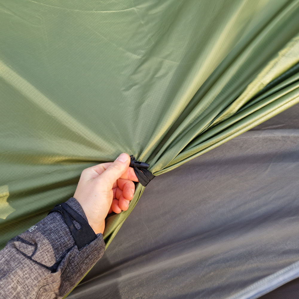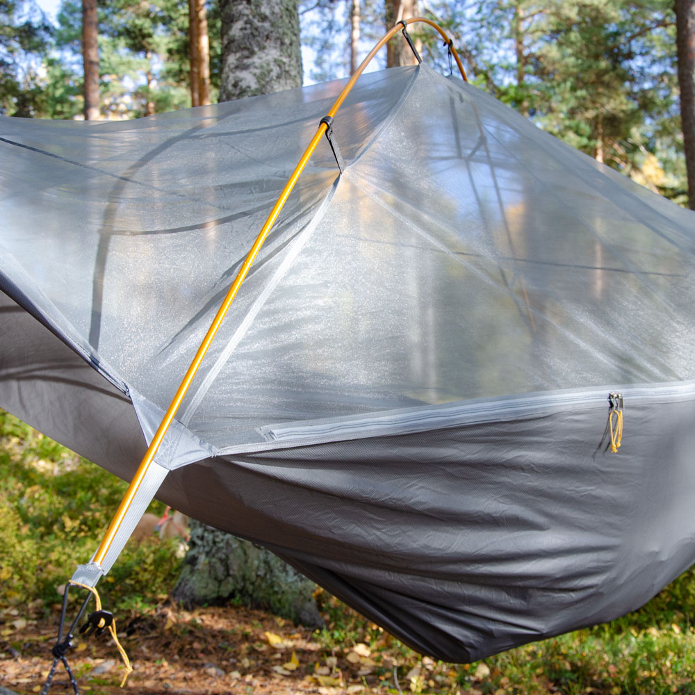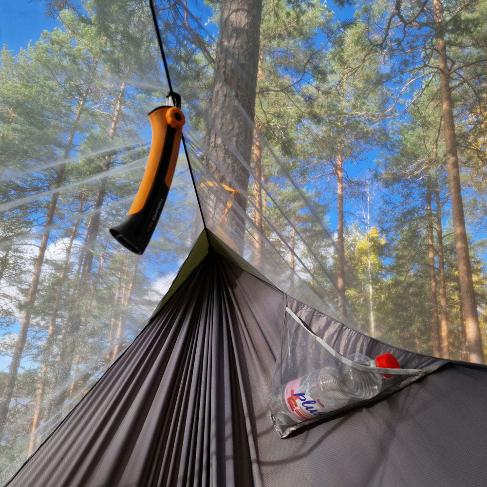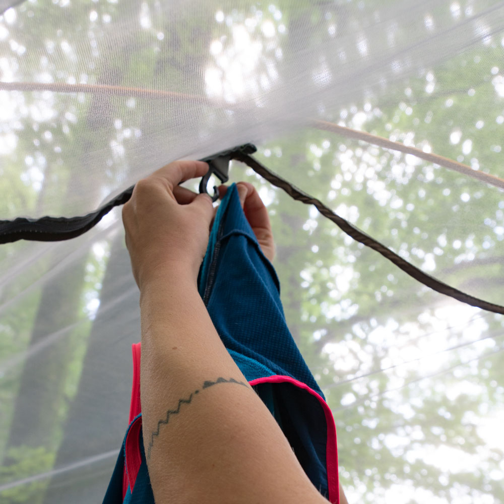 Dank des Gestänges bietet diese Hängematte mit Moskitonetz und Tarp auch eine stabile Höhe innerhalb des Zeltes: So kannst du dich umziehen und das Zelt entspannt betreten und verlassen, ohne dich ganz klein zu machen. Außerdem bietet es weitere Wohlfühlfaktoren: Dank des Innenfaches kannst du dich in deinem Baumhaus einrichten und an einem an der Decke hängendem Haken lässt sich eine Taschenlampe befestigen – dein Zuhause hängend zwischen zwei Bäumen!
