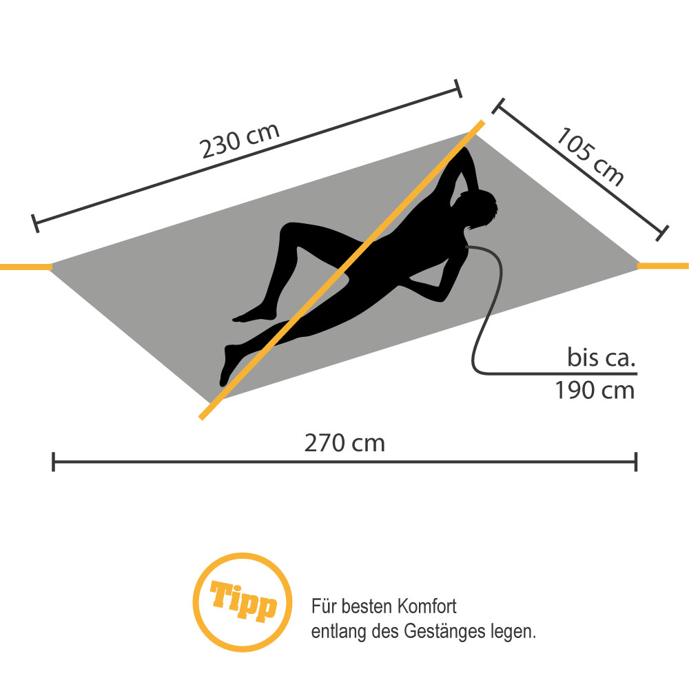 Die Hängematte mit Tarp ist optimal für Personen mit einer Größe bis zu 1,90 m. Auch noch größere Personen können es sich im Zelt gemütlich machen, allerdings können diese sich nicht diagonal hinlegen, wodurch die Hängematte leicht durchhängt und der Rücken nicht gerade liegt. Die Ridge Line sorgt dafür, dass du immer den gewünschten Hängewinkel und somit die optimale Liegeposition beibehältst.