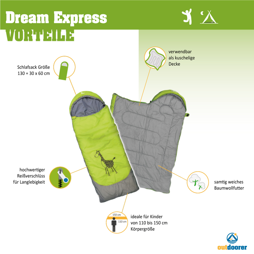 Schlafsäcke für Erwachsene sind für Kinder nicht passend. Sie rutschen im Schlaf tief hinein, weil er zu lang und zu weit ist. Der Kinderschlafsack Dream Express ist deshalb 130 cm lang, 60 cm breit und hat ein 30 cm Kopfteil mit Wärmekragen. So ist er perfekt auf die Bedürfnisse von Kindern angepasst, nicht zu lang und eng genug zum Reinkuscheln. Mit seinem geringen Gewicht von 1000 Gramm ist er auch für Kinder leicht zu handhaben.