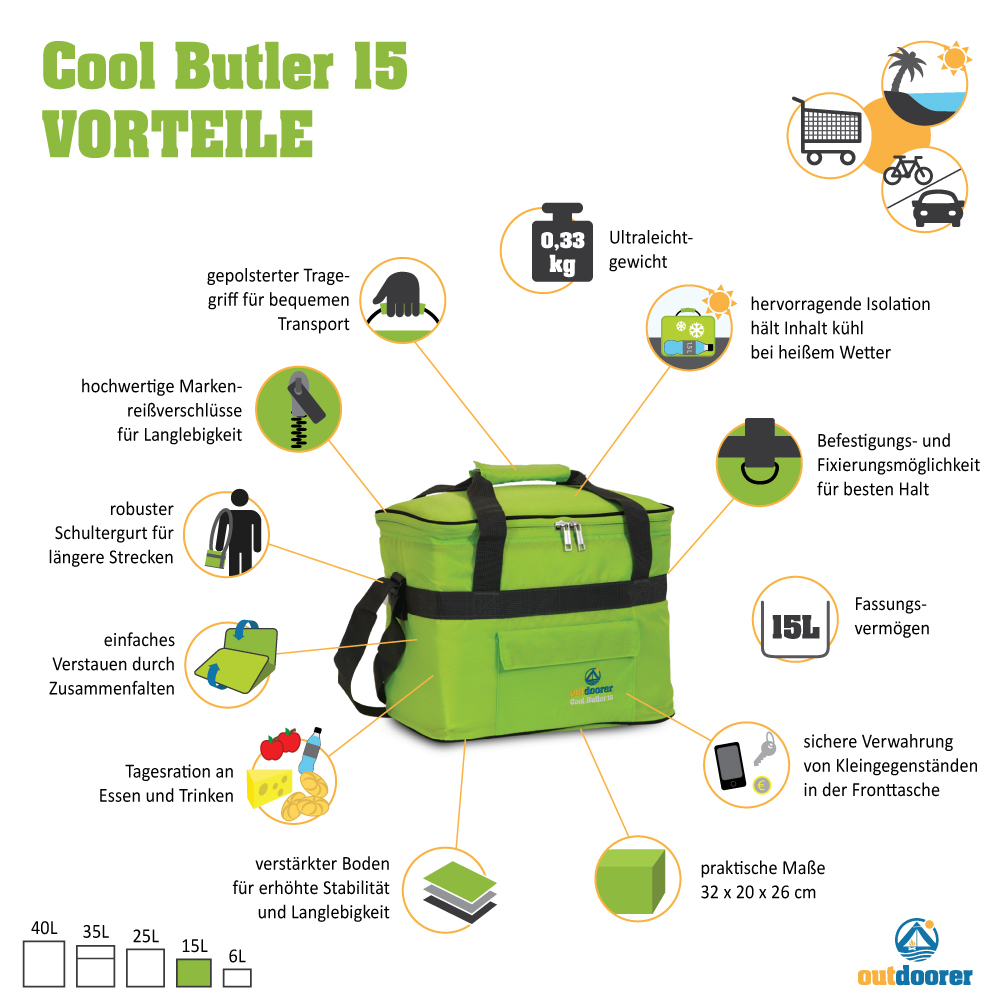 Du bist klar im Vorteil, wenn du deine eigenen kühlen Getränke in einer Kühltasche mithast. Mit der Kühltasche Cool Butler 25 ist das kein Problem. Einfach die Kühltasche öffnen und die mitgebrachte Erfrischung genießen.Kennst du nicht auch Situationen wie diese? Es ist ein schöner, heißer und sonniger Tag am Strand oder am Badesee. Du bist durstig und willst dir etwas zum Trinken holen, aber die Schlange am Kiosk ist endlos lang. Als du endlich an der Reihe bist und dein kaltes Getränk genießen willst, ist dieses lauwarm. Hier bist du klar im Vorteil, wenn du deine eigenen kühlen Getränke in ein Kühltasche mithast. Mit der Kühltasche Cool Butler 25 ist das kein Problem. Einfach die Kühltasche öffnen und die mitgebrachte Erfrischung genießen. Technische Facts – Cool Butler 25 l Kühltasche von outdoorer Volumen: 25 Liter Größe: 36 x 24 x 34 cm Gewicht: ca. 0,43 kg robustes Ripstop Material PEVA Innenfutter lebensmittelecht 8 mm EPE- Isolierung für besonders lange Isolierleistung ummantelte Tragegriffe Schulterriemen Außentasche sehr gute Isolation outdoorer Design in grün/grau hochwertiger, ummantelter Reißverschluss Außenrand des Bodens verstärkt faltbar Cool Butler 25 – ein kleines Raumwunder Mit seiner Größe von 36 x 24 x 34 cm und einem Volumen von 25 Litern ist die Kühltasche Cool Butler 25 ein kleines Raumwunder. Mit der praktischen Höhe von 35 Zentimetern lassen sich bequem 1,5 Liter PET-Flaschen in ihr verstauen. Kühltasche für Touren mit dem Motor- oder Fahrrad Die Kühltasche Cool Butler 25 ist wegen ihrer kompakten Größe ideal für Ausflüge mit dem Motorrad oder Fahrrad. Die Tasche am Gepäcksträger festschnallen und los geht es. Deine Speisen und Getränke bleiben über einen langen Zeitraum schön gekühlt, auch bei der größten Hitze. Praktisch als Kühltasche für den Einkauf Nicht nur für Ausflüge ist die Kühltasche Cool Butler 25 l geeignet, sondern auch als Kühltasche für den wöchentlichen Lebensmitteleinkauf. Besonders im Sommer ist es eine Herausforderung, gefrorene Lebensmittel oder Frischware wie Fisch oder Meeresfrüchte unbeschadet nach Hause zu bringen. Abhilfe schafft der Cool Butler 25. Die Lebensmittel bleiben in ihm lange gekühlt. Um niedrige Temperaturen über Stunden zu garantieren, empfiehlt outdoorer Ihnen die Verwendung von zusätzlichen Kühlakkus. Ummantelte Tragegriffe und stabiler Schulterriemen für komfortables Tragen Der Weg vom Auto zum Rastplatz ist etwas weiter? Kein Problem für den Cool Butler 25, denn er hat ummantelte Tragegriffe und einen festen Schulterriemen. Damit ist selbst das Tragen einer prall gefüllten Kühltasche kein Problem mehr. Außentasche für Keinigkeiten Die Kühltasche Cool Butler 25 besitzt auf der Vorderseite eine praktische Außentasche. Darin können Sie Kleinigkeiten wie Taschenmeser, Reisebesteck, Flaschenöffner oder eine Zeitschrift sicher verstauen und hast du schnell griffbereit.