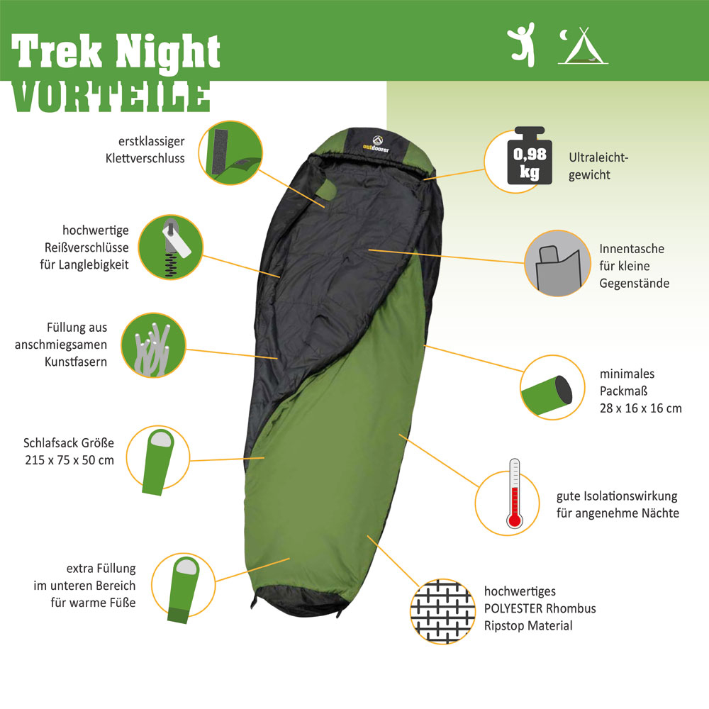 Zur Vervollständigung der Trekkingserie von outdoorer mit Rucksack, Leichtzelt und selbstaufblasender Isomatte gibt es noch den extrem leichten Schlafsack Trek Night. Dieser zeichnet sich durch sein geringes Gewicht und sein Minipackmaß aus. In kühleren Nächten wärmt er dich zuverlässig durch den Einsatz von hochwertigen Materialien.