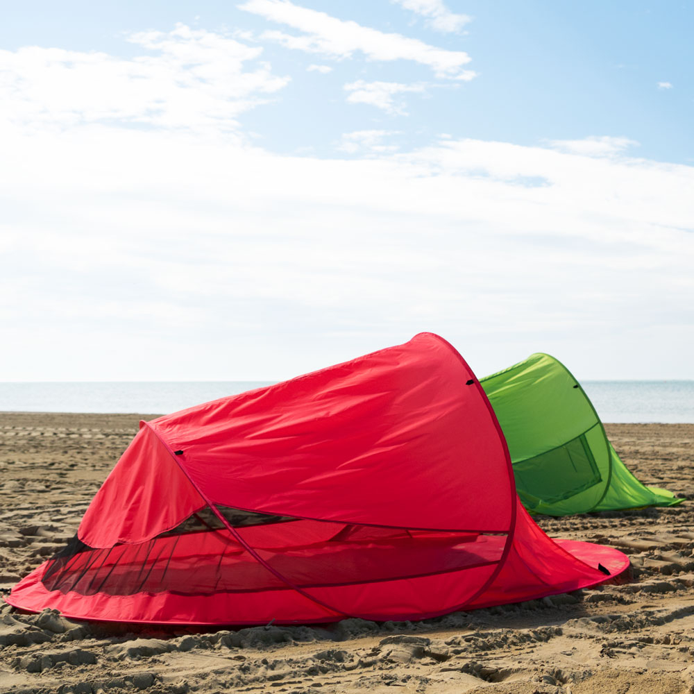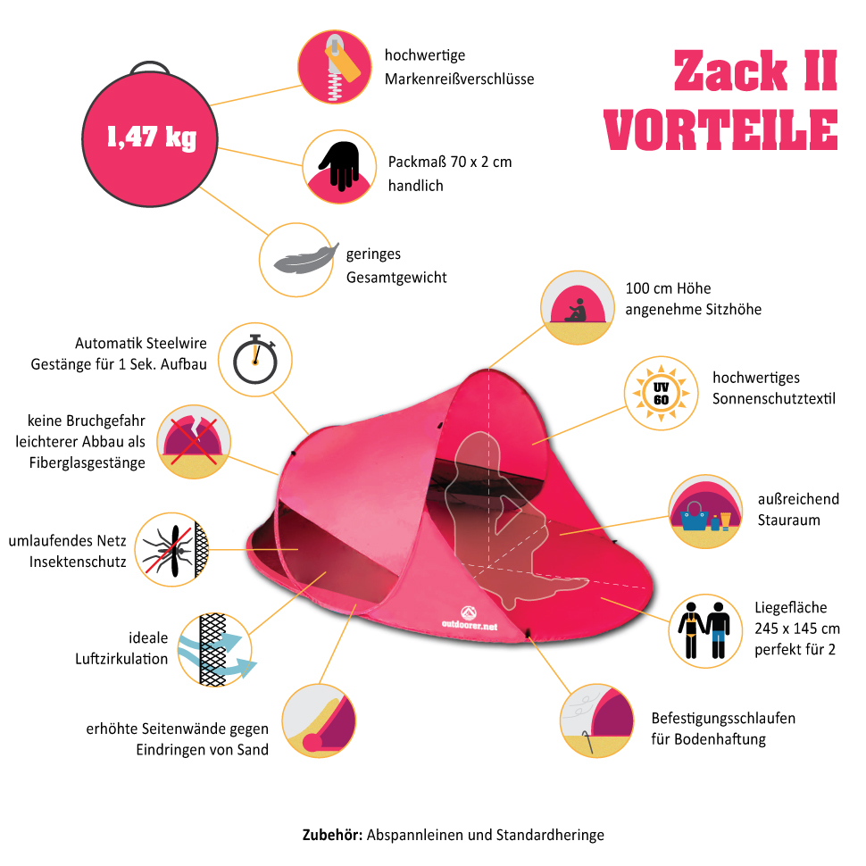 Mit der Pop Up Strandmuschel Zack II in Grün von outdoorer bist du der absolute Star am Strand. Der Aufbau ist dank Automatik Steelwire Gestänge mehr als einfach. Öffne die Transporttasche und werfe die Zack II an die gewünschte Stelle am Strand. Jetzt noch schnell mit Heringen befestigen und schon steht einem entspannten Tag am Strand nichts mehr im Weg. Technische Facts – Pop Up Strandmuschel Zack II selbstaufbauende Strandmuschel für 2 Personen hoher UV-Schutz: UV 60 Maße: 245 x 145 x 100 cm Packmaß: 70 x 70 x 2 cm Gewicht: 1,47 kg Wassersäule: 450 mm Material: Lumotex 60 Boden aus Oxford Polyester Gestänge: Automatik Steelwire Gestänge Gestängeeinfassungen: extrem reißfestes Oxford Polyester Praktische Aufhängeschlaufe zur Befestigung von Lampe oder Ventilator Farbe: grün (auch in Blau und Pink erhältlich) umlaufendes Moskitonetz für optimale Belüftung Zubehör: Abspannleinen, Heringe und Transporttasche aus dem Original Zeltmaterial Super schneller Aufbau in Sekunden Nicht umsonst sind selbstaufbauende Strandmuscheln so beliebt. Der Aufbau ist in sekundenschnelle erledigt und du hast mehr Zeit um den Tag zu genießen. Möglich wird dies durch das flexible Stahlgestänge. Solange sich die Strandmuschel Zack II in der Transporthülle befindet, steht sie unter Spannung. Diese entlädt sich, sobald du die Strandmuschel aus der Tasche gibst und loslässt. Du musst die Strandmuschel nur mehr mit den Heringen befestigen. Fertig! Der Abbau gelingt mit etwas Übung fast ebenso schnell. Feines Moskitonetz sorgt für eine optimale Belüftung Besonders an heißen Tagen staut sich schnell die warme Luft im Zelt. Die Pop Up Strandmuschel Zack II ist deshalb mit einem umlaufenden Moskitonetz ausgestattet. Frische Luft kann ins Zeltinnere strömen und sorgt für eine optimale Luftzirkulation. Durch das feine Moskitonetz bleiben nicht nur Insekten draußen, sondern auch feiner Flugsand. Praktische Aufhängeschlaufe für noch mehr Komfort Die Pop-Up Strandmuschel punktet nicht nur mit ihrem schnellen Aufbau, sondern auch mit cleveren Details: Im Dach des Strandzeltes befindet sich eine integrierte Aufhängeschlaufe. Hier kannst du zum Beispiel unseren praktischen 3-in-1 Ventilator befestigen – eine echte Allround-Lösung, die Ventilator, Licht und Powerbank in einem Gerät vereint. Einfach einhängen und den Komfort genießen! Sehr guter Sonnenschutz dank Lichtschutzfaktor UV 60 Für outdoorer ist das Thema Sonnenschutz sehr wichtig und deshalb ist die Zack II Strandmuschel auch mit dem hohen Lichtschutzfaktor UV 60 ausgestattet. Dieser gilt nicht für den Netzeinsatz. Schließlich sollen du und deine Famlie den Tag am Strand genießen können! Exzellenter Windschutz Am Strand weht meistens eine kühle Brise. An sehr heißen Tagen mag dies eine Wohltat sein, aber an besonders windigen Küstenabschnitten oder einem nicht ganz so heißen Tag, ist ein windgeschützter Unterschlupf oft angenehm. Die Pop Up Strandmuschel Zack II ist deshalb nicht nur ein super Sonnenschutz, sondern auch ein exzellenter Windschutz. Mit den mitgelieferten Heringen und Anspannleinen steht eure Strandmuschel stabil. Bei sehr feinem Sand oder starkem Wind empfiehlt outdoorer die Verwendung von Sandheringen. Genügend Platz zu zweit und mit den Strandutensilien Die Strandmuschel Zack II bietet dir und deiner Begleitung genügend Platz. Sie ist mit 245 x 145 x 100 cm großzügig geschnitten und ihr könnt euch bequem hinlegen, ohne dass eure Füße im Sand sind. Im Eingangsbereich könnt ihr sogar aufrecht sitzen.