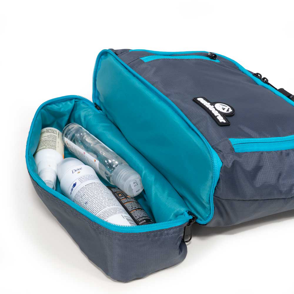 Minimalistisch – beispielsweise nur mit Handgepäck – zu reisen, spart Platz und Gewicht und sorgt für hohe Flexibilität, birgt jedoch auch so manche Herausforderung, um dennoch hohen Komfort zu garantieren. Der kleine Kulturbeutel Wash Butler S von outdoorer vereint hier stylisches Design mit idealer Reisegröße, durchdachter Fächeraufteilung und optimaler Nutzung des bestehenden Volumens. Technische Facts – Kleiner Kulturbeutel zum Aufhängen Wash Butler S von outdoorer Ideal für Kurztrips, Geschäftsreisen und Trekking Farbe: Türkis Volumen: 1,5 l Abmessungen: 23 x 8 x 8 cm Gewicht: ca. 113 g Außenmaterial: Polyester Innenmaterial: Stabiles Mesh + Polyester 2 verschließbare Innenfächer 1 verschließbares Außenfach 1 offenes Außenfach Aufhänge-Schlaufe Gummischlaufen SBS-Reißverschlüsse Als kleiner Kulturbeutel ultraleicht Der Wash Butler S von outdoorer wird als Waschbeutel dank seiner handlichen Abmessungen von 23 x 8 x 8 cm und einem ultraleichten Gewicht von nur 113 g dein unverzichtbarer Begleiter auf Reisen. Dabei weist das Necessaire in stylischem Türkis ein geräumiges Volumen von 1,5 l auf. Kleiner Kulturbeutel – ganz groß Dank dieses großzügigen Fassungsvermögens ist Platz für alle essenziellen Hygieneartikel auf Reisen. Denn in den Wash Butler S passen unter anderem Zahnbürste, Zahnpasta, Rasierapparat, Seifenblättchen, Insektenspray, Duschgel und Shampoo in Reisegröße. Kleiner Waschbeutel mit vielen Fächern Zu dieser effizienten Unterbringung trägt auch das durchdachte Fächersystem bei. Das große Hauptfach ist mit 2 Innenfächern ausgestattet, wobei sich eines der beiden an 2 Stellen öffnen lässt – so wird ein Herausrutschen der darin untergebrachten Körperpflege-Utensilien vermieden. Zudem ist der kleine Reise-Kulturbeutel mit einem Außenfach versehen. Sämtliche Reißverschlüsse wurden vom namhaften Hersteller SBS produziert. Kulturbeutel zum Aufhängen für freie Hände Dank eines robusten Bandes kann die Kulturtasche beispielsweise an einem Haken oder einem Ast aufgehängt werden, um den Wash Butler S vor Nässe und Schmutz und in Greifnähe zu bewahren. Hinter diesem Haken befindet sich noch ein praktisches Fach, das sich ideal als „Abstellfläche“ für Duschgel, Zahnpasta etc. eignet, so bleiben beide Hände für Morgen-/Abendtoilette und Körperpflege frei. Zusätzlich ist in das Innere des kleinen Waschbeutels ein mittig fixiertes Gummiband genäht – perfekt, um Zahnbürste oder Handrasierer zu transportieren. Reise-Kulturbeutel – ideal fürs Handgepäck So ist der Kulturbeutel Wash Butler S ein exzellenter Begleiter für Kurztrips und Geschäftsreisen, jedoch auch für Backpacking, Hüttenübernachtungen und Trekking. Besonders praktisch ist, dass der Waschbeutel spielend leicht im Handgepäck Platz findet. Doch achte dabei immer darauf, was in die Kabine mitgenommen werden darf – hier empfehlen wir auch das Reiseflaschen-Set von Lifeventure.