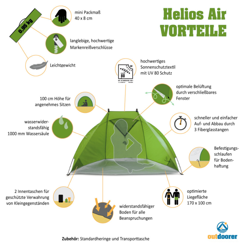 Jetzt Helios Air bestellen und bei jeder Art von Reise zuverlässig geschützt und gleichzeitig mit ausreichend Luft in der Strandmuschel versorgt sein: dank UV Schutz 80 und Netzfenster!